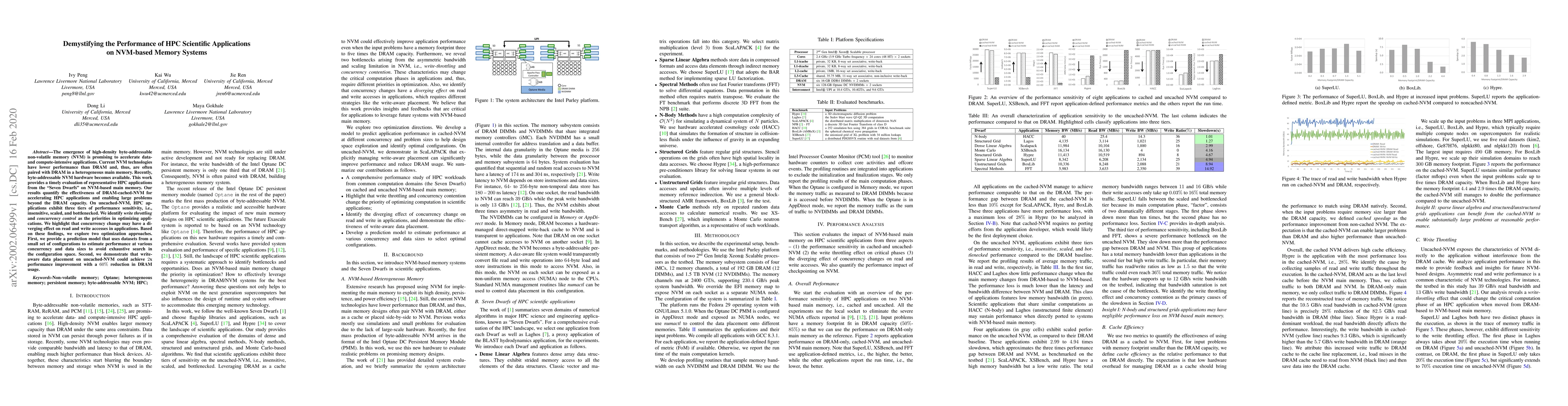 This paper evaluates HPC applications on NVM-based memory systems, finding performance varies across three tiers on uncached NVM. It proposes optimization strategies, including a prediction model for performance estimation and a write-aware data placement strategy that achieves a 2x performance improvement and reduces DRAM usage by 60%.