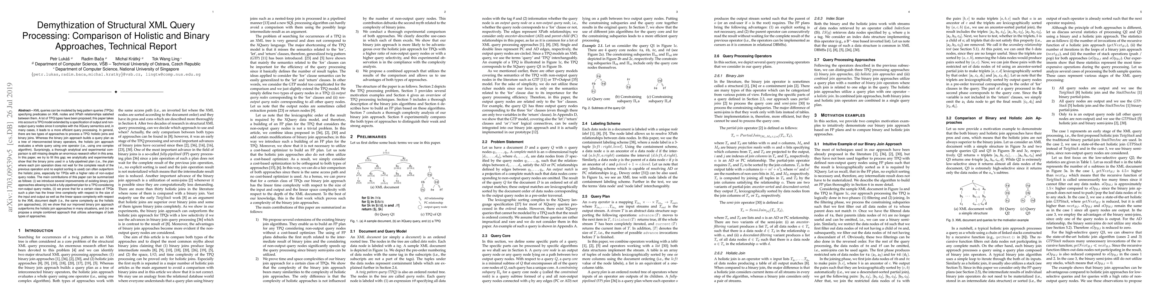 This paper compares holistic and binary approaches for processing XML twig pattern queries (TPQ), showing that binary joins, especially in fully-pipelined plans, often outperform holistic joins. The authors propose improvements to binary join methods, demonstrate their linear time and space complexity, and suggest a combined approach leveraging the strengths of both methods.