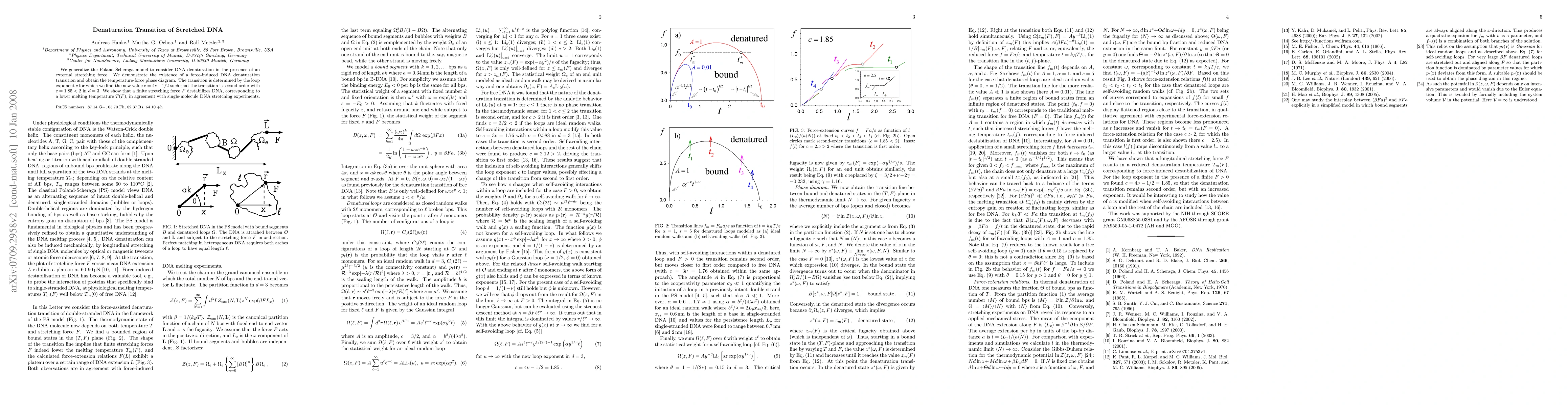 This paper generalizes the Poland-Scheraga model to study DNA denaturation under stretching forces, revealing a force-induced denaturation transition and a temperature-force phase diagram. The transition is second order with a loop exponent $c=4\nu-1/2$ ($c=1.85$ in three dimensions), and a finite stretching force lowers the melting temperature, aligning with experimental observations.