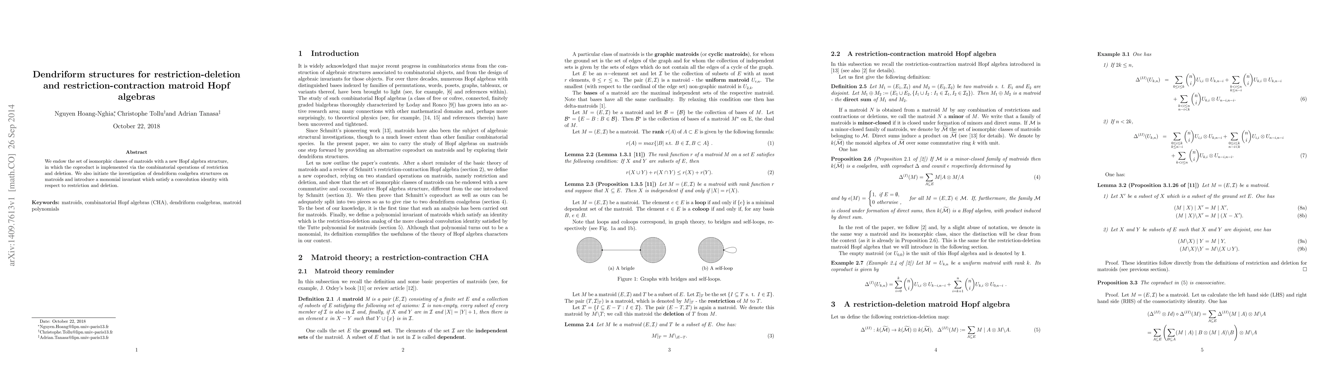 We endow the set of isomorphic classes of matroids with a new Hopf algebra structure, in which the coproduct is implemented via the combinatorial operations of restriction and deletion. We also initiate the investigation of dendriform coalgebra structures on matroids and introduce a monomial invariant which satisfy a convolution identity with respect to restriction and deletion.