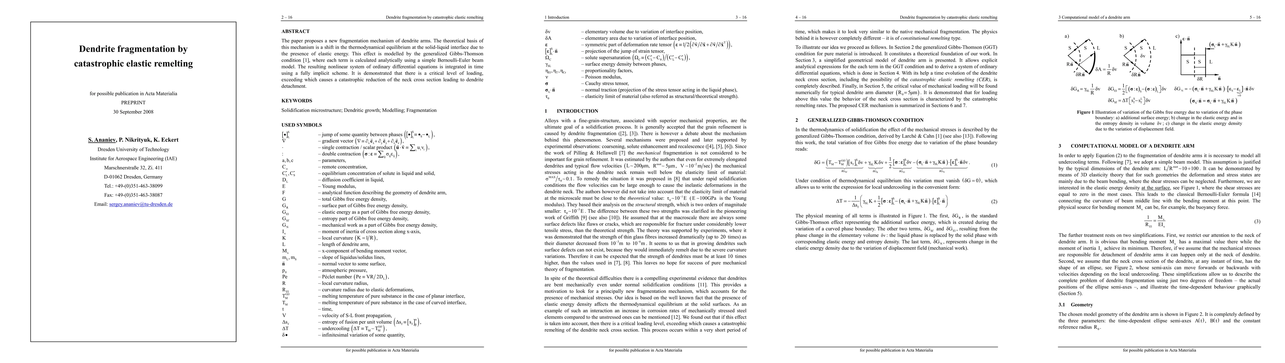 The paper proposes a new fragmentation mechanism of dendrite arms. The theoretical basis of this mechanism is a shift in the thermodynamical equilibrium at the solid-liquid interface due to the presence of elastic energy. This effect is modelled by the generalized Gibbs-Thomson condition [1], where each term is calculated analytically using a simple Bernoulli-Euler beam model. The resulting nonlinear system of ordinary differential equations is integrated in time using a fully implicit scheme. It is demonstrated that there is a critical level of loading, exceeding which causes a catastrophic reduction of the neck cross section leading to dendrite detachment.