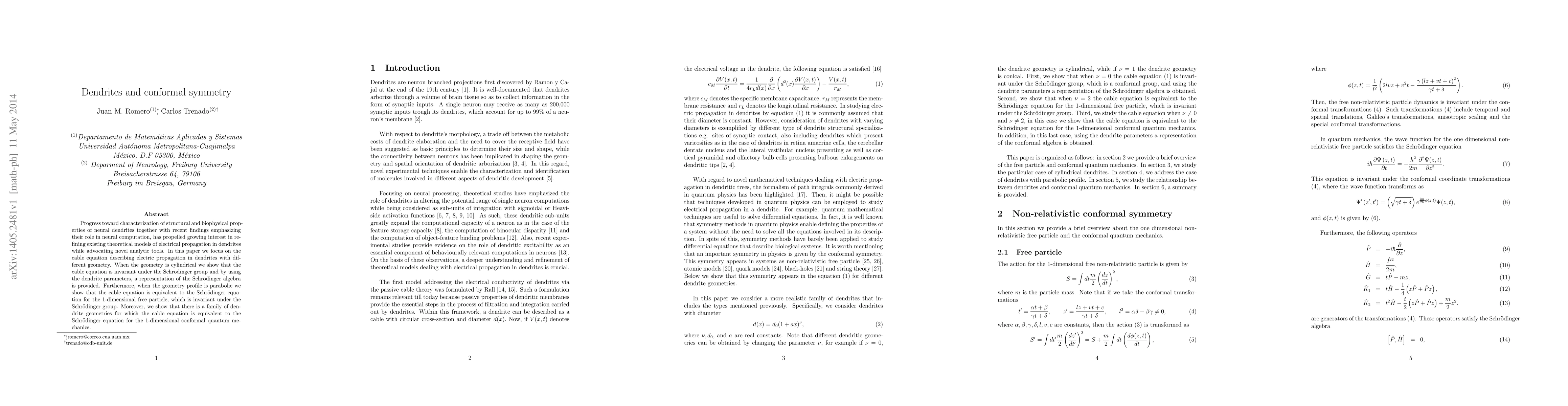 Progress toward characterization of structural and biophysical properties of neural dendrites together with recent findings emphasizing their role in neural computation, has propelled growing interest in refining existing theoretical models of electrical propagation in dendrites while advocating novel analytic tools. In this paper we focus on the cable equation describing electric propagation in dendrites with different geometry. When the geometry is cylindrical we show that the cable equation is invariant under the Schr\"odinger group and by using the dendrite parameters, a representation of the Schr\"odinger algebra is provided. Furthermore, when the geometry profile is parabolic we show that the cable equation is equivalent to the Schr\"odinger equation for the 1-dimensional free particle, which is invariant under the Schr\"odinger group. Moreover, we show that there is a family of dendrite geometries for which the cable equation is equivalent to the Schr\"odinger equation for the 1-dimensional conformal quantum mechanics.