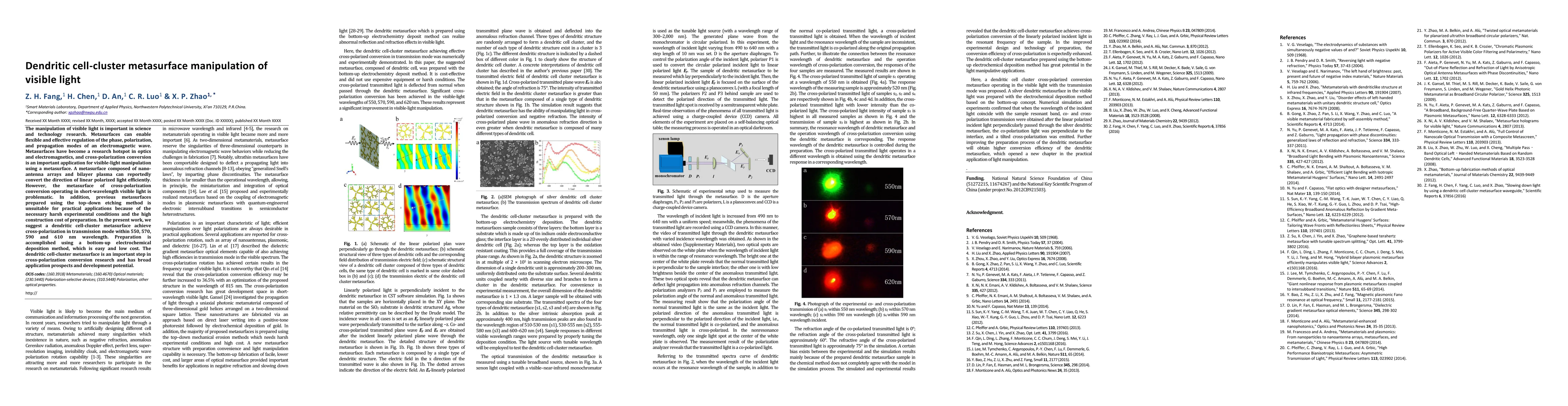 This paper proposes a dendritic cell-cluster metasurface for efficient cross-polarization conversion of visible light within specific wavelengths, utilizing a cost-effective bottom-up electrochemical deposition method instead of top-down etching. This advancement addresses practical applications and broadens the potential for optical technology.