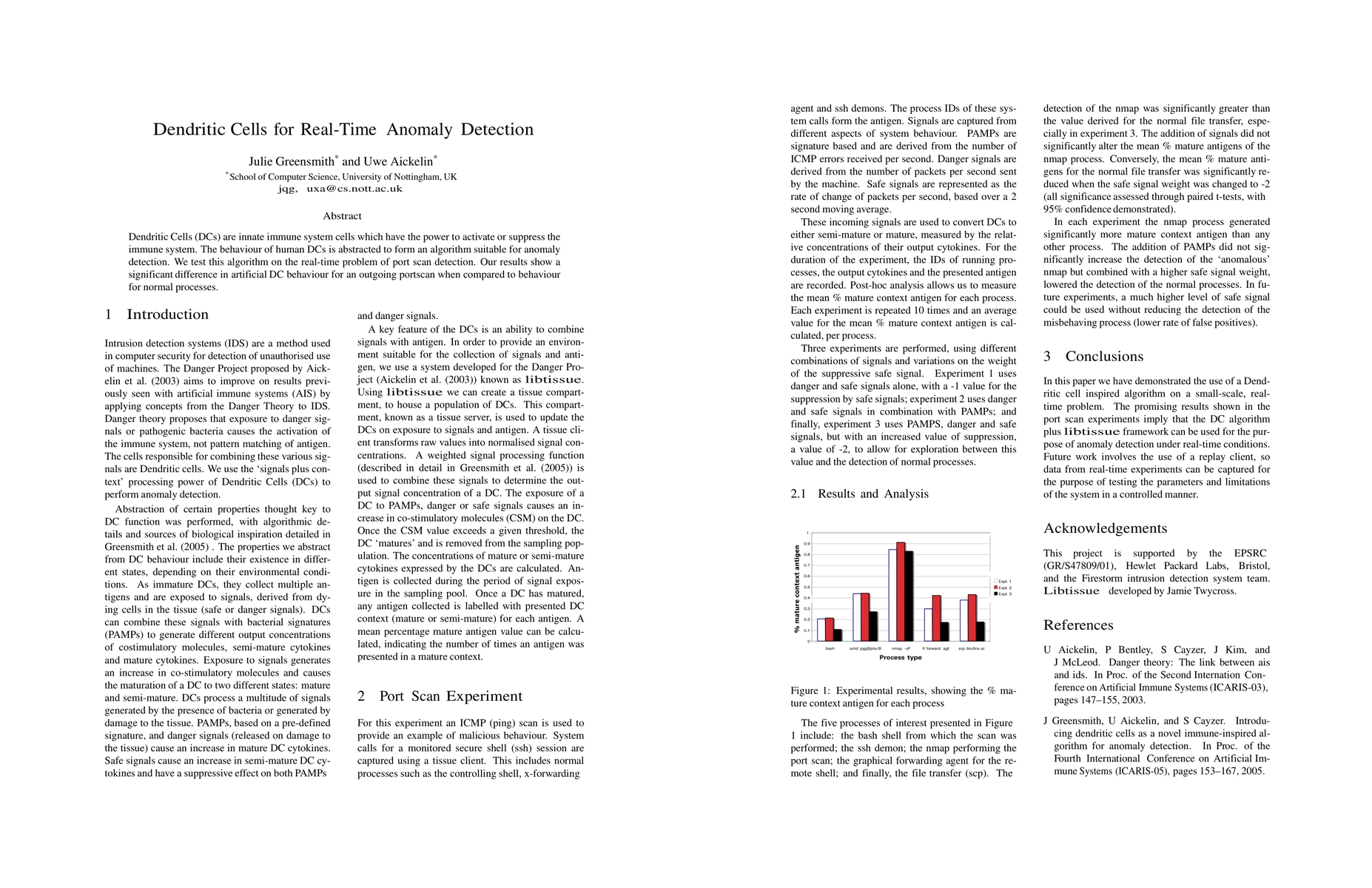 Dendritic Cells (DCs) are innate immune system cells which have the power to activate or suppress the immune system. The behaviour of human of human DCs is abstracted to form an algorithm suitable for anomaly detection. We test this algorithm on the real-time problem of port scan detection. Our results show a significant difference in artificial DC behaviour for an outgoing portscan when compared to behaviour for normal processes.