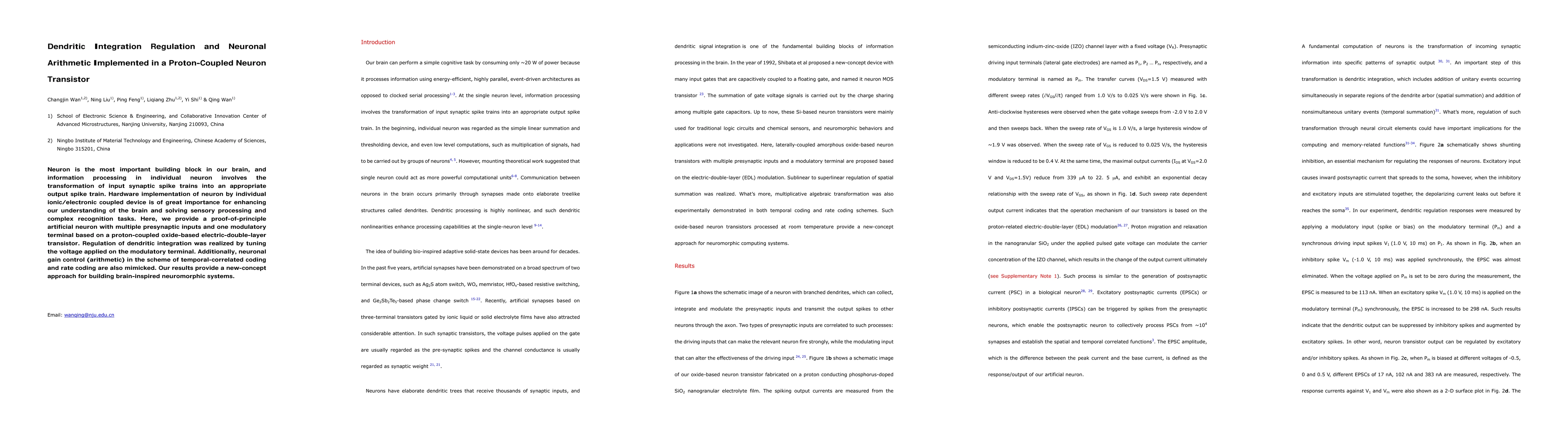 This paper presents an artificial neuron implemented in a proton-coupled oxide-based electric-double-layer transistor, demonstrating dendritic integration regulation and neuronal arithmetic. The device mimics synaptic spike train processing and allows for modulation of integration through voltage tuning, offering a new approach for neuromorphic systems.