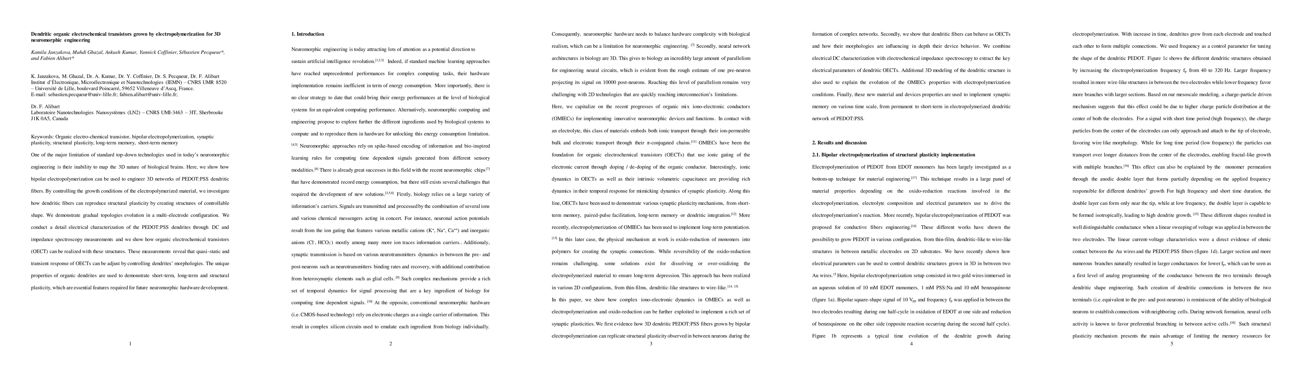 This paper presents a method for creating 3D networks of PEDOT:PSS dendritic fibers using bipolar electropolymerization, enabling the reproduction of structural plasticity and demonstrating organic electrochemical transistors (OECTs) with adjustable quasi-static and transient responses. The study highlights the potential for these organic dendrites to support short-term, long-term, and structural plasticity, crucial for future neuromorphic hardware.