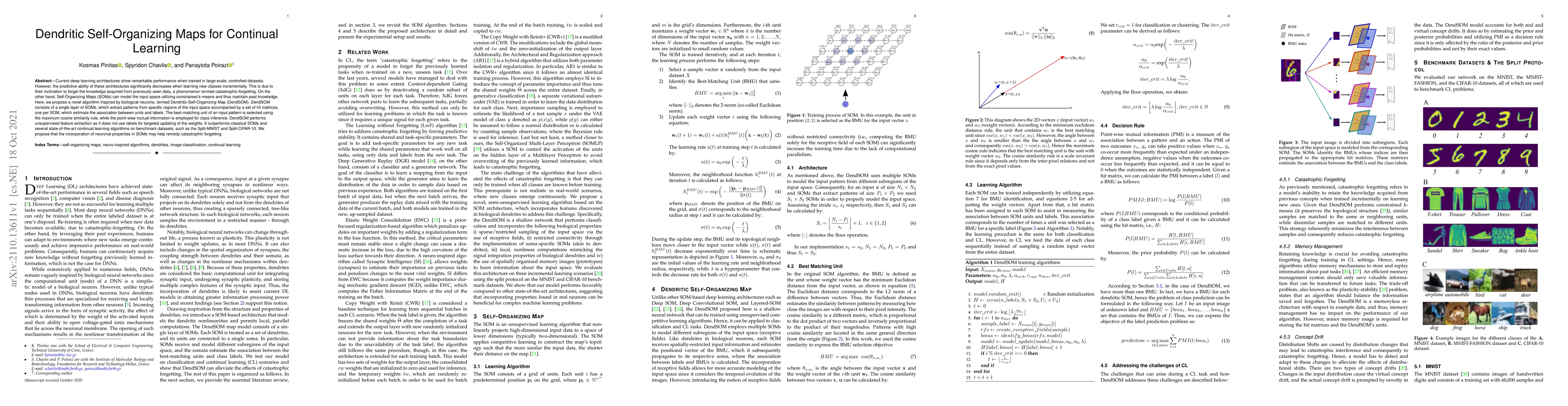 The research introduces Dendritic-Self-Organizing Maps (DendSOM), a novel continual learning algorithm that incorporates neuronal properties to address catastrophic forgetting, outperforming classical SOMs and other state-of-the-art methods on benchmark datasets. DendSOM combines SOMs with hit matrices and mutual information to perform unsupervised feature extraction.
