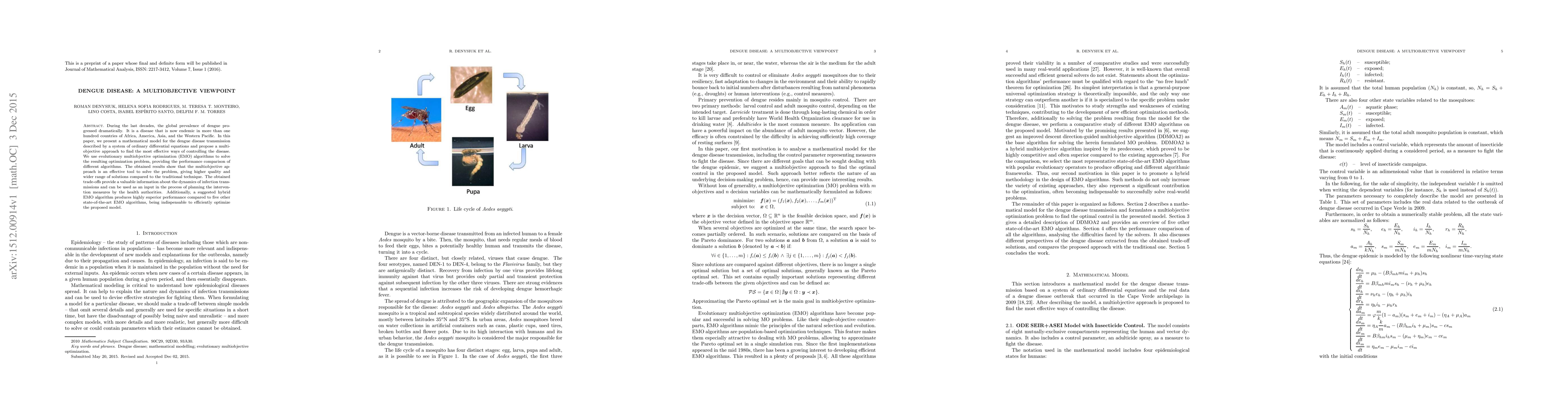 During the last decades, the global prevalence of dengue progressed dramatically. It is a disease that is now endemic in more than one hundred countries of Africa, America, Asia, and the Western Pacific. In this paper, we present a mathematical model for the dengue disease transmission described by a system of ordinary differential equations and propose a multiobjective approach to find the most effective ways of controlling the disease. We use evolutionary multiobjective optimization (EMO) algorithms to solve the resulting optimization problem, providing the performance comparison of different algorithms. The obtained results show that the multiobjective approach is an effective tool to solve the problem, giving higher quality and wider range of solutions compared to the traditional technique. The obtained trade-offs provide a valuable information about the dynamics of infection transmissions and can be used as an input in the process of planning the intervention measures by the health authorities. Additionally, a suggested hybrid EMO algorithm produces highly superior performance compared to five other state-of-the-art EMO algorithms, being indispensable to efficiently optimize the proposed model.