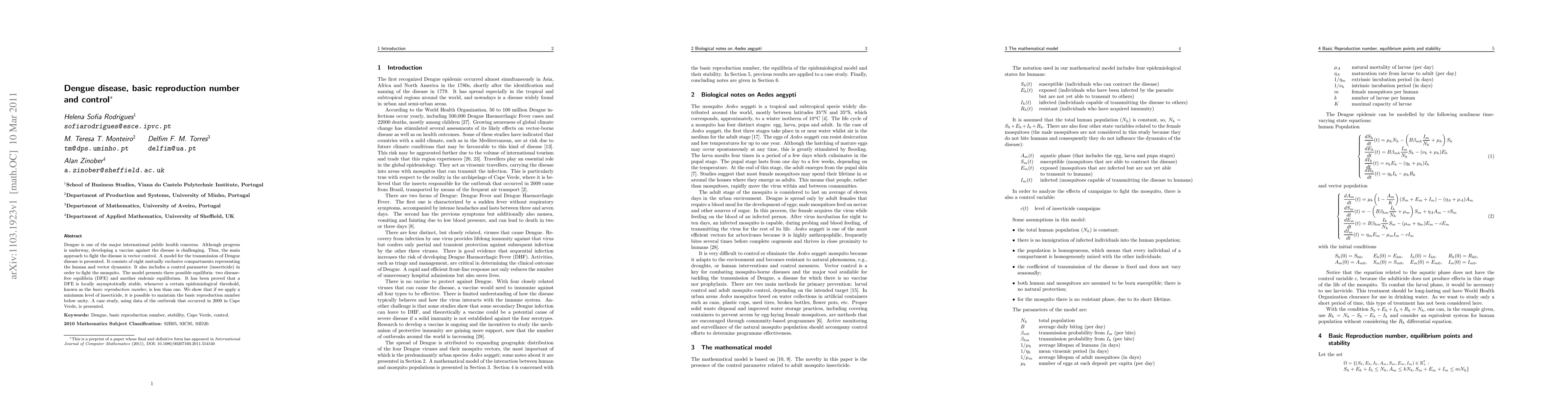 This paper presents a mathematical model for Dengue disease transmission, incorporating human and vector dynamics with a control parameter for insecticide use. It demonstrates that maintaining the basic reproduction number below one through vector control can achieve disease-free equilibria, supported by a case study of the 2009 Cape Verde outbreak.