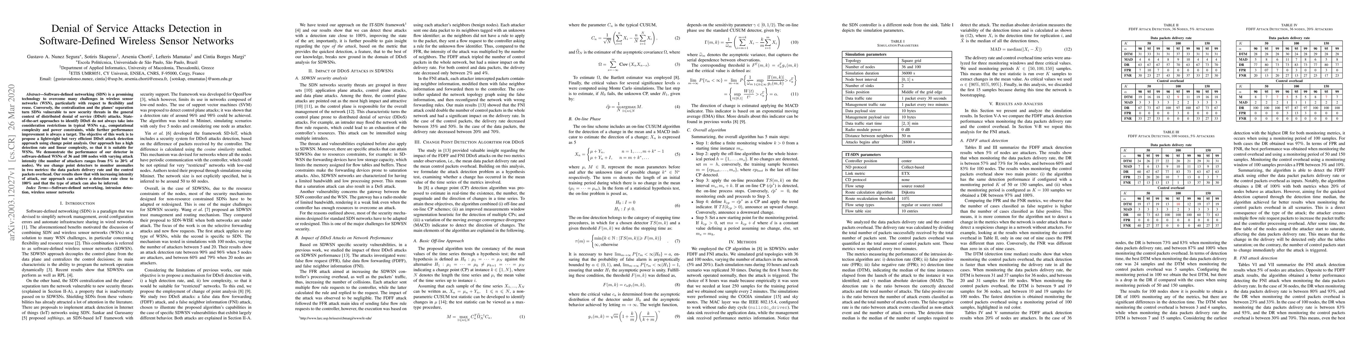 This paper proposes a lightweight DDoS attack detection method for software-defined wireless sensor networks using change point analysis, achieving high detection rates with linear complexity suitable for resource-constrained WSNs. The method monitors anomalies in data packets delivery rate and control packets overhead, demonstrating near 100% detection rate with varying attack intensities.