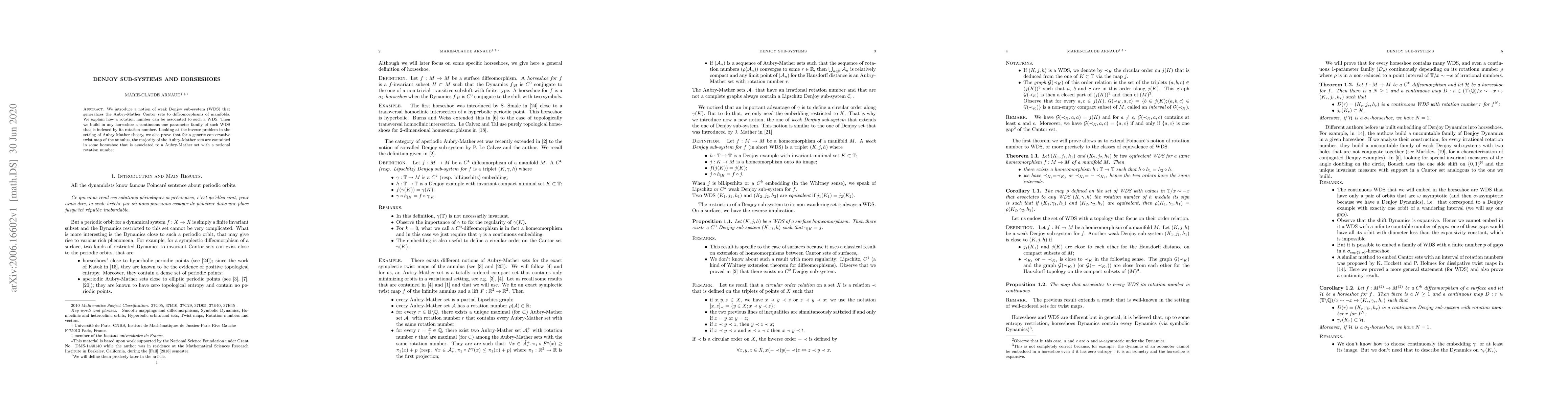 We introduce a notion of weak Denjoy subsystem (WDS) that generalizes the Aubry-Mather Cantor sets to diffeomorphisms of manifolds. We explain how a rotation number can be associated to such a WDS. Then we build in any horseshoe a continuous one parameter family of such WDS that is indexed by its rotation number. Looking at the inverse problem in the setting of Aubry-Mather theory, we also prove that for a generic conservative twist map of the annulus, the majority of the Aubry-Mather sets are contained in some horseshoe that is associated to a Aubry-Mather set with a rational rotation number.