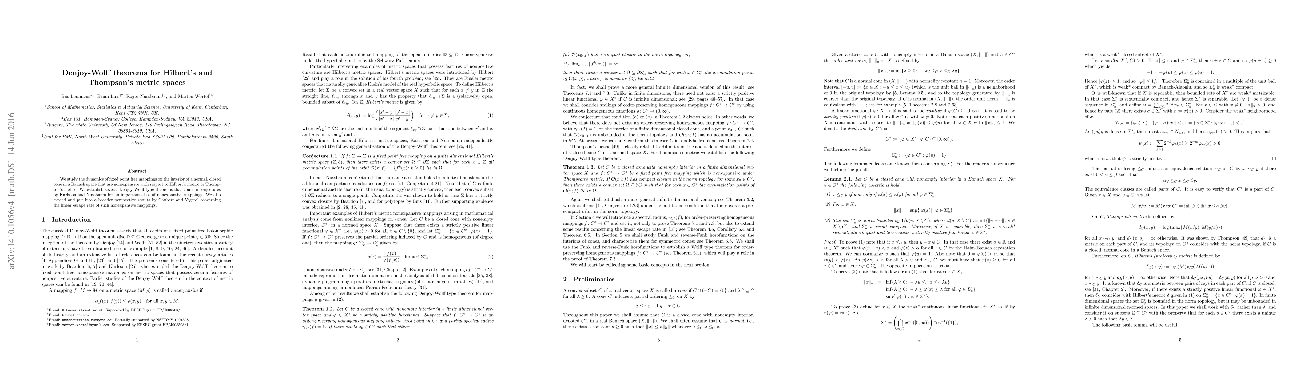 This paper investigates the dynamics of fixed point free, nonexpansive mappings in the interior of a normal, closed cone in Banach spaces, focusing on Hilbert's and Thompson's metrics. It establishes Denjoy-Wolff theorems confirming conjectures for these mappings and extends results on the linear escape rate.