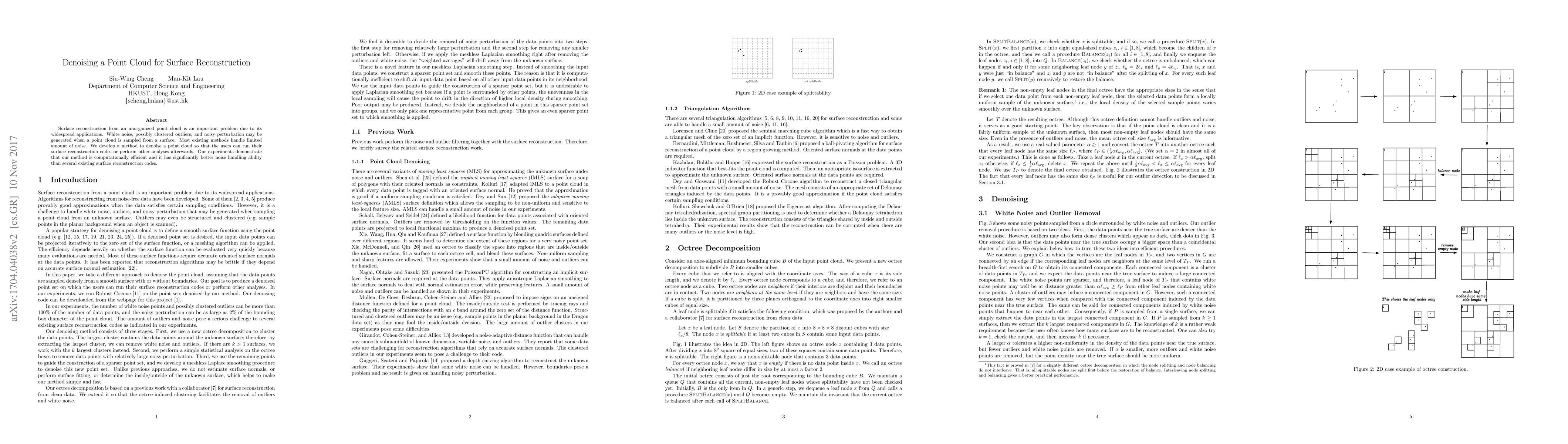 This paper presents a novel method for denoising point clouds to improve surface reconstruction accuracy, demonstrating superior noise handling and computational efficiency compared to existing methods. The proposed approach effectively mitigates white noise and clustered outliers, enabling better subsequent surface reconstruction and analysis.