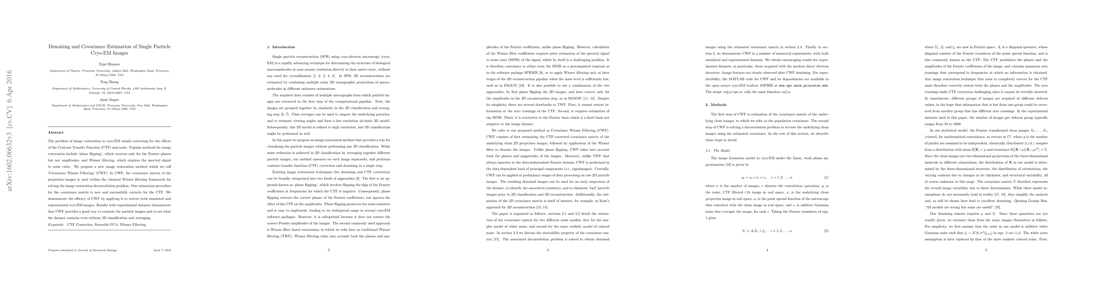 The paper proposes a new "Covariance Wiener Filtering" (CWF) method for denoising and restoring single particle cryo-EM images, using the covariance matrix within the Wiener filtering framework to correct for the Contrast Transfer Function and noise. Experimental results show CWF effectively restores images without requiring 2D classification and averaging.