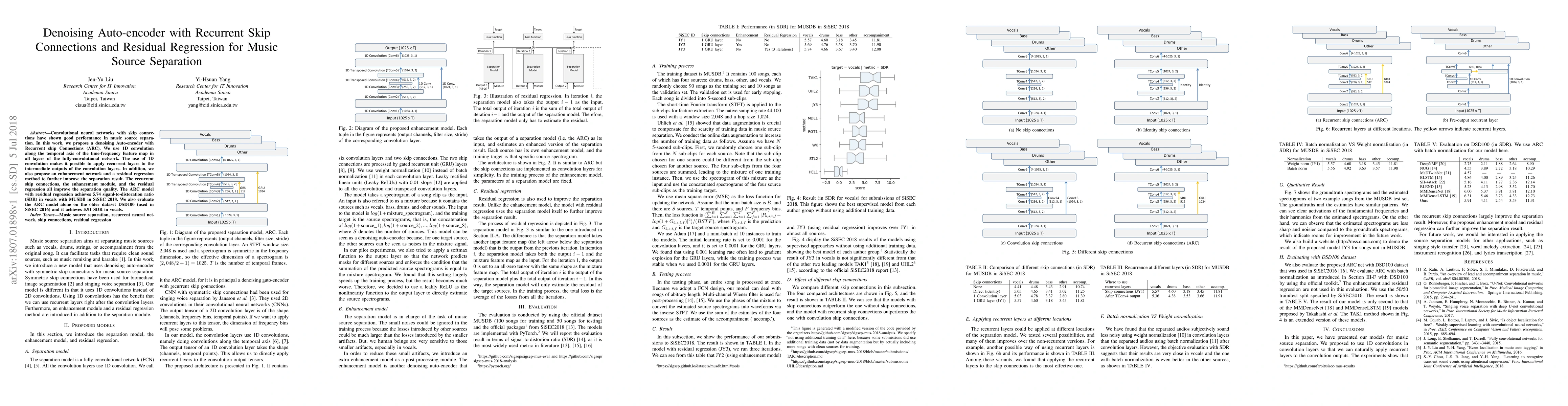 A new deep learning model called Denoising Auto-encoder with Recurrent Skip Connections and Residual Regression (ARC) improves music source separation by combining 1D convolution, recurrent layers, and residual regression, achieving high signal-to-distortion ratios on popular datasets.