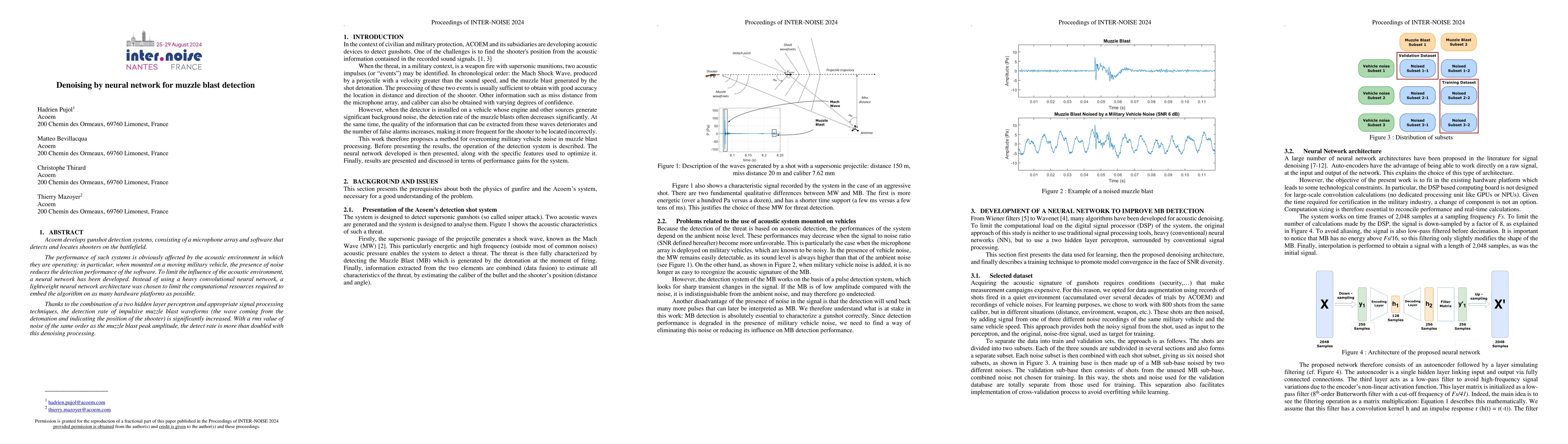Acoem develops gunshot detection systems, consisting of a microphone array and software that detects and locates shooters on the battlefield. The performance of such systems is obviously affected by the acoustic environment in which they are operating: in particular, when mounted on a moving military vehicle, the presence of noise reduces the detection performance of the software. To limit the influence of the acoustic environment, a neural network has been developed. Instead of using a heavy convolutional neural network, a lightweight neural network architecture was chosen to limit the computational resources required to embed the algorithm on as many hardware platforms as possible. Thanks to the combination of a two hidden layer perceptron and appropriate signal processing techniques, the detection rate of impulsive muzzle blast waveforms (the wave coming from the detonation and indicating the position of the shooter) is significantly increased. With a rms value of noise of the same order as the muzzle blast peak amplitude, the detect rate is more than doubled with this denoising processing.