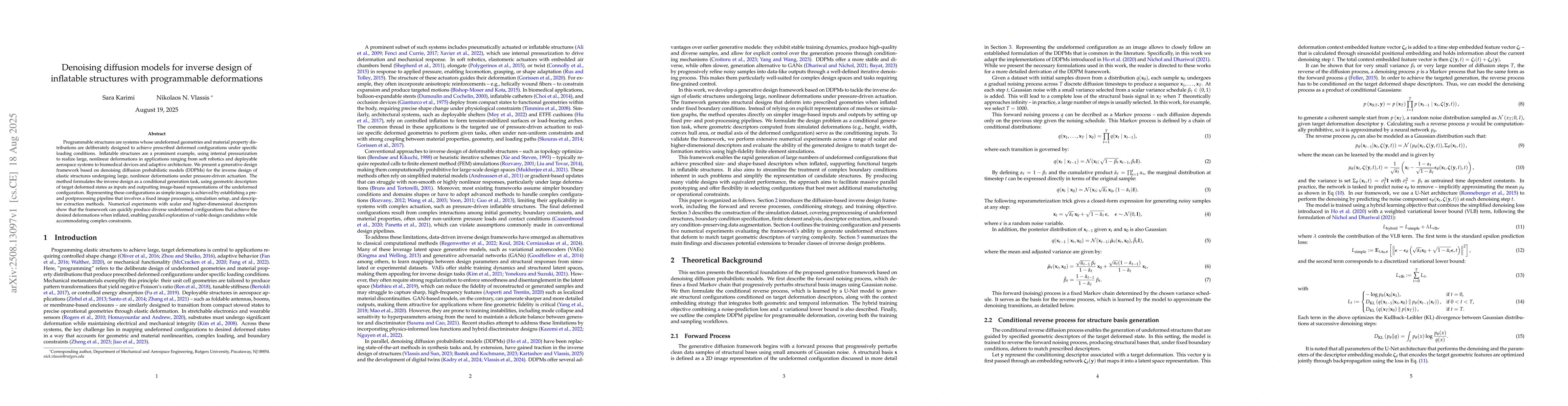 Programmable structures are systems whose undeformed geometries and material property distributions are deliberately designed to achieve prescribed deformed configurations under specific loading conditions. Inflatable structures are a prominent example, using internal pressurization to realize large, nonlinear deformations in applications ranging from soft robotics and deployable aerospace systems to biomedical devices and adaptive architecture. We present a generative design framework based on denoising diffusion probabilistic models (DDPMs) for the inverse design of elastic structures undergoing large, nonlinear deformations under pressure-driven actuation. The method formulates the inverse design as a conditional generation task, using geometric descriptors of target deformed states as inputs and outputting image-based representations of the undeformed configuration. Representing these configurations as simple images is achieved by establishing a pre- and postprocessing pipeline that involves a fixed image processing, simulation setup, and descriptor extraction methods. Numerical experiments with scalar and higher-dimensional descriptors show that the framework can quickly produce diverse undeformed configurations that achieve the desired deformations when inflated, enabling parallel exploration of viable design candidates while accommodating complex constraints.