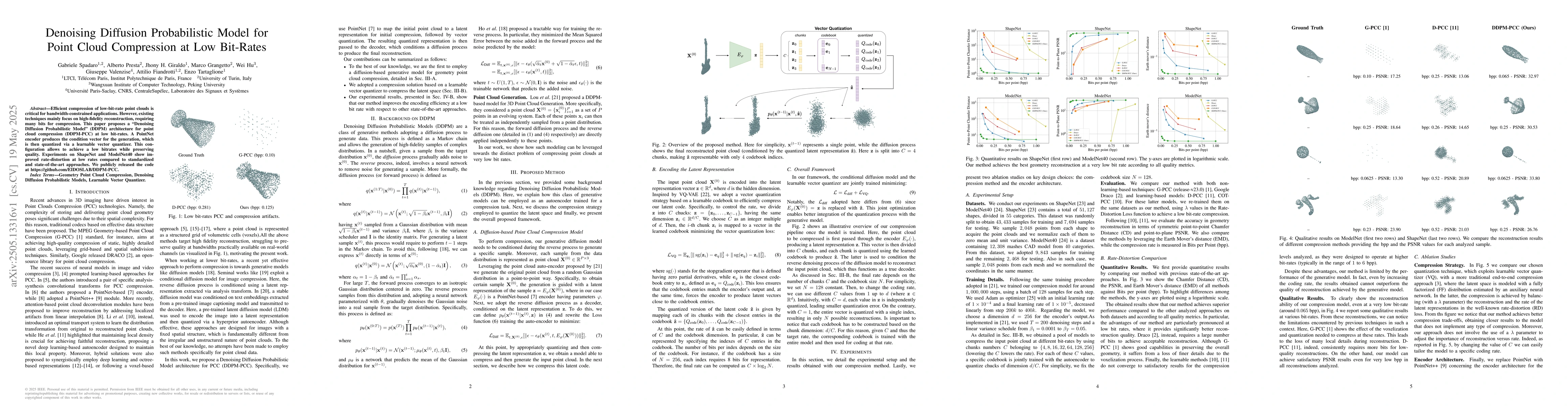 This work distinguishes itself by focusing on low bit-rate point cloud compression, employing a novel DDPM architecture, and utilizing a learnable vector quantizer for quantization.