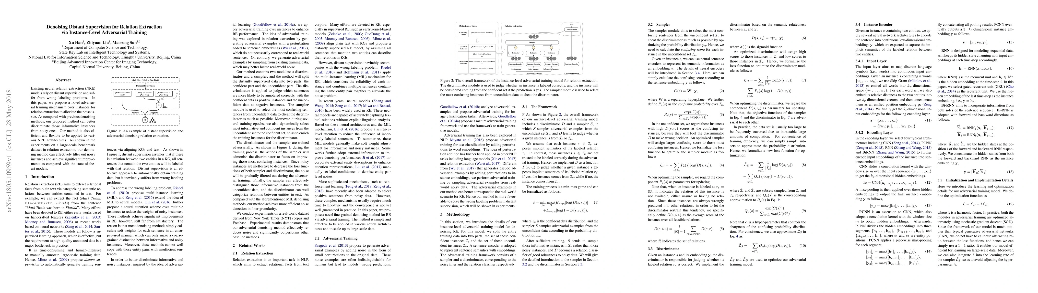 This paper introduces an adversarial training mechanism to improve neural relation extraction models by denoising distant supervision. The proposed method effectively filters out noisy instances, leading to significant performance gains compared to state-of-the-art models on benchmark datasets.