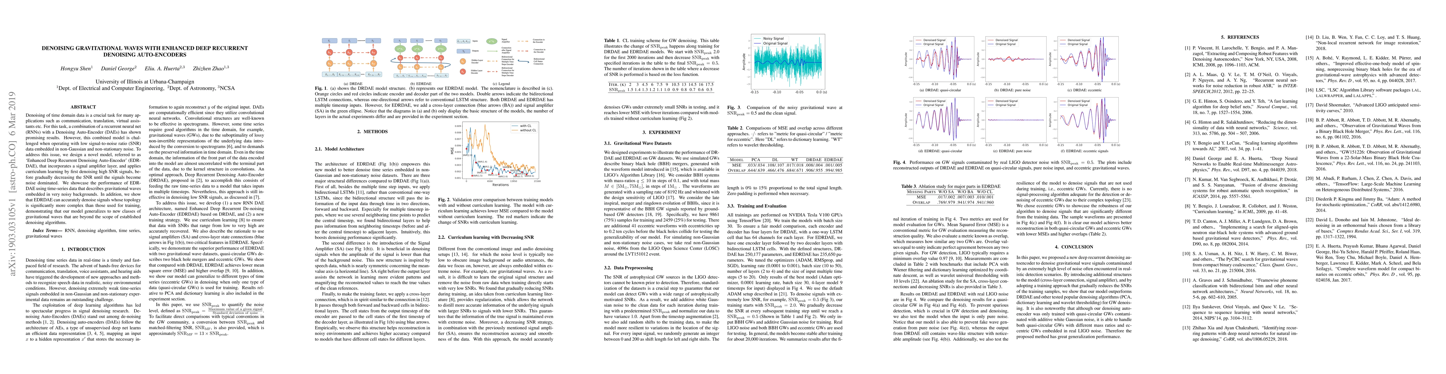 Denoising of time domain data is a crucial task for many applications such as communication, translation, virtual assistants etc. For this task, a combination of a recurrent neural net (RNNs) with a Denoising Auto-Encoder (DAEs) has shown promising results. However, this combined model is challenged when operating with low signal-to-noise ratio (SNR) data embedded in non-Gaussian and non-stationary noise. To address this issue, we design a novel model, referred to as 'Enhanced Deep Recurrent Denoising Auto-Encoder' (EDRDAE), that incorporates a signal amplifier layer, and applies curriculum learning by first denoising high SNR signals, before gradually decreasing the SNR until the signals become noise dominated. We showcase the performance of EDRDAE using time-series data that describes gravitational waves embedded in very noisy backgrounds. In addition, we show that EDRDAE can accurately denoise signals whose topology is significantly more complex than those used for training, demonstrating that our model generalizes to new classes of gravitational waves that are beyond the scope of established denoising algorithms.