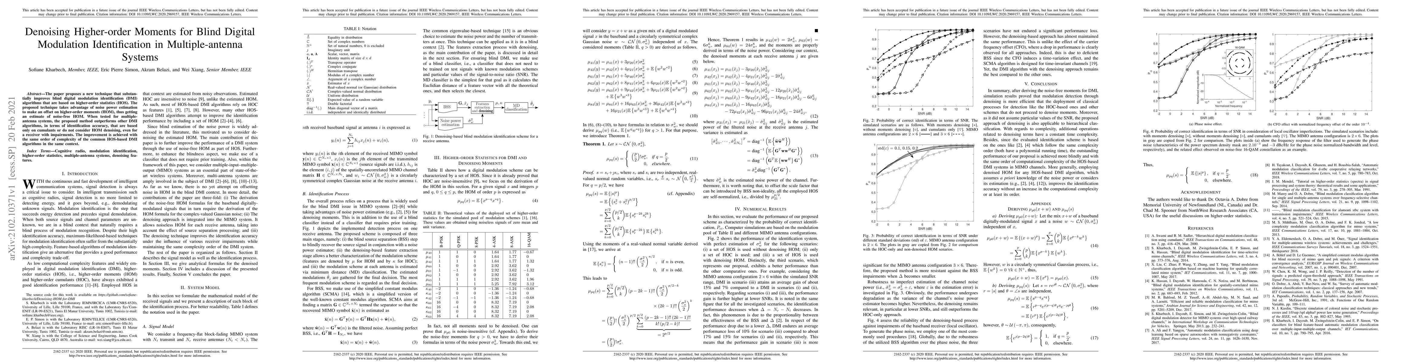 The paper introduces a denoising technique for higher-order moments to enhance blind digital modulation identification in multiple-antenna systems, achieving superior accuracy and comparable complexity to existing methods. The method leverages noise power estimation to correct higher-order moments, significantly improving identification performance.