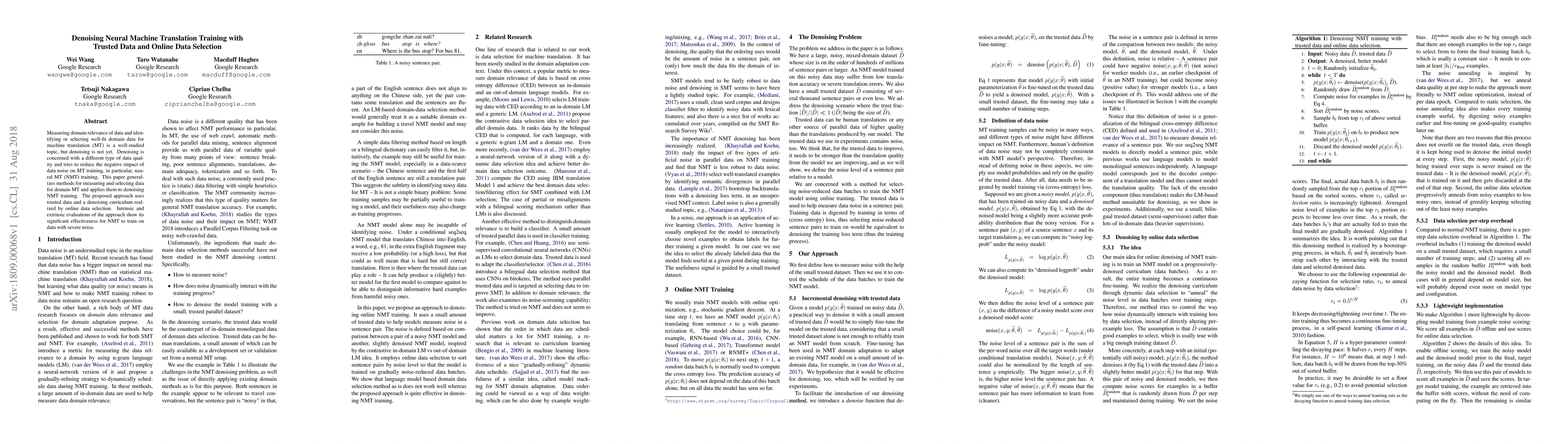 This paper proposes a method for denoising neural machine translation (NMT) training using trusted data and online data selection to mitigate the impact of data noise. The approach demonstrates significant effectiveness in NMT training on noisy datasets, as shown by both intrinsic and extrinsic evaluations.