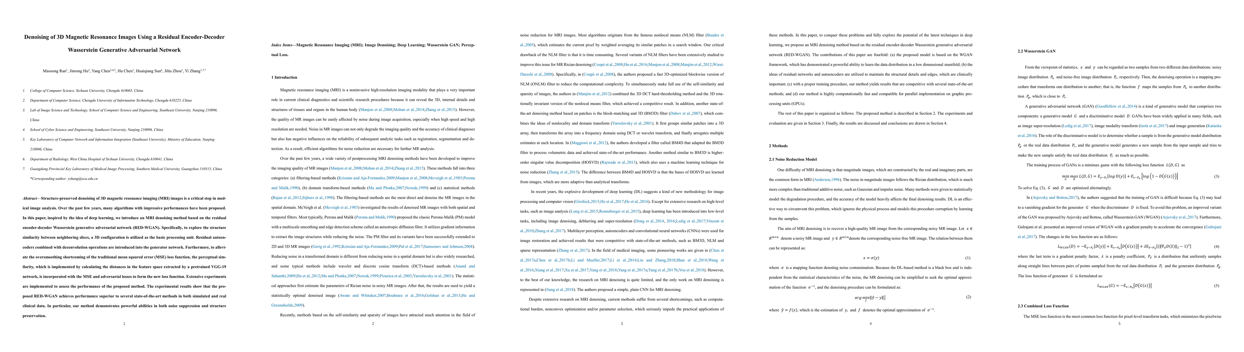 This paper proposes a 3D residual encoder-decoder Wasserstein generative adversarial network (RED-WGAN) for denoising MRI images, combining residual autoencoders with deconvolution and perceptual similarity to outperform existing methods in noise suppression and structure preservation. Experimental results show superior performance over state-of-the-art techniques.