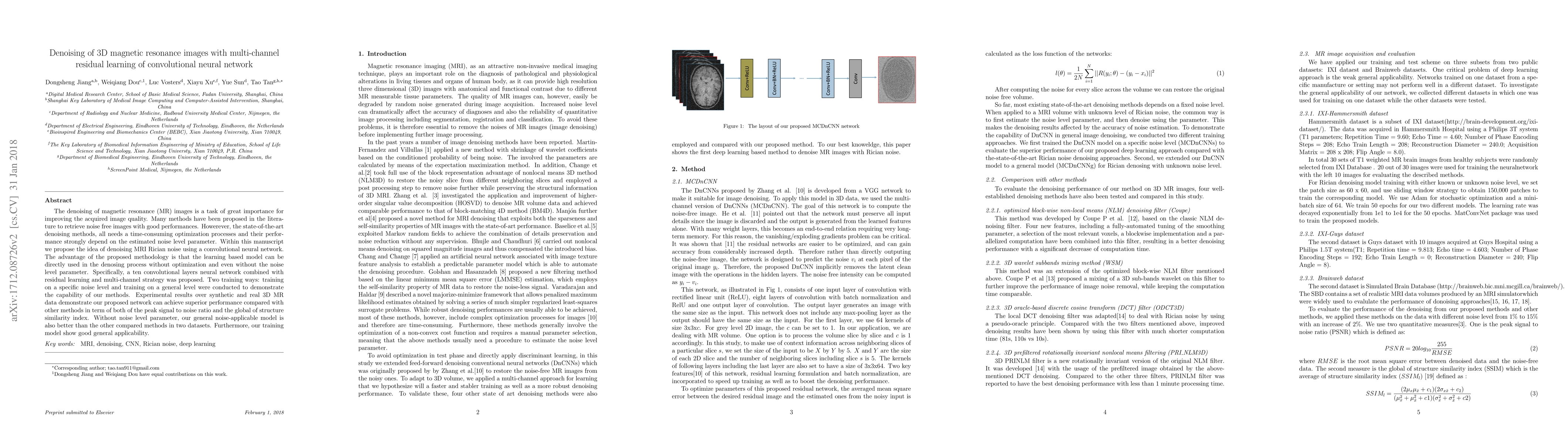 This paper proposes a convolutional neural network with residual learning and multi-channel strategy for denoising 3D magnetic resonance images. The method achieves superior performance without requiring optimization or noise level parameters, and demonstrates good general applicability across different datasets.
