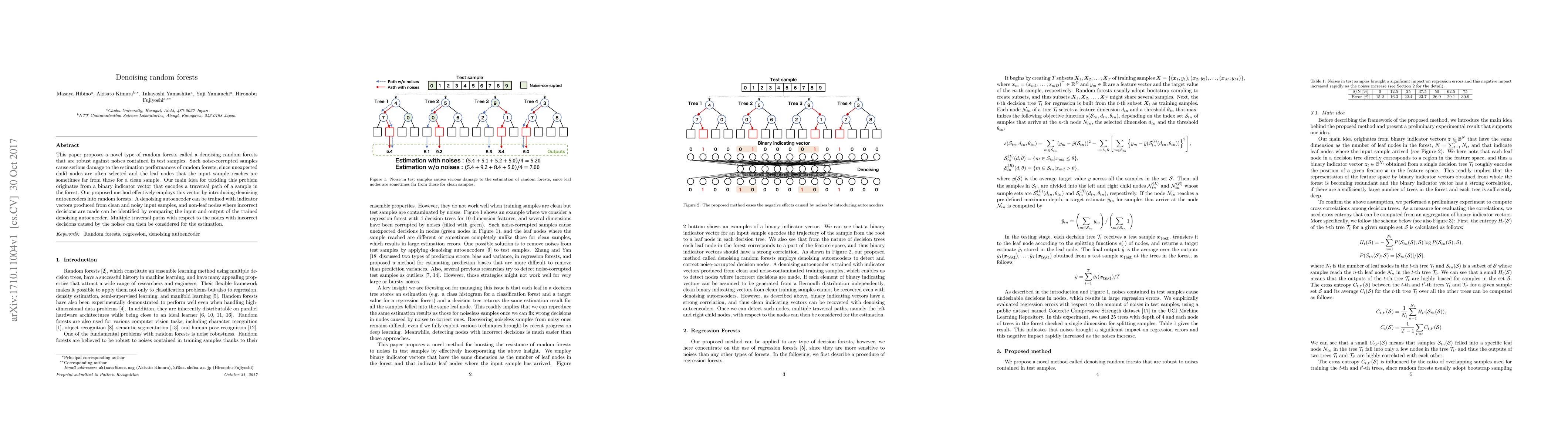 This paper proposes a novel type of random forests called a denoising random forests that are robust against noises contained in test samples. Such noise-corrupted samples cause serious damage to the estimation performances of random forests, since unexpected child nodes are often selected and the leaf nodes that the input sample reaches are sometimes far from those for a clean sample. Our main idea for tackling this problem originates from a binary indicator vector that encodes a traversal path of a sample in the forest. Our proposed method effectively employs this vector by introducing denoising autoencoders into random forests. A denoising autoencoder can be trained with indicator vectors produced from clean and noisy input samples, and non-leaf nodes where incorrect decisions are made can be identified by comparing the input and output of the trained denoising autoencoder. Multiple traversal paths with respect to the nodes with incorrect decisions caused by the noises can then be considered for the estimation.