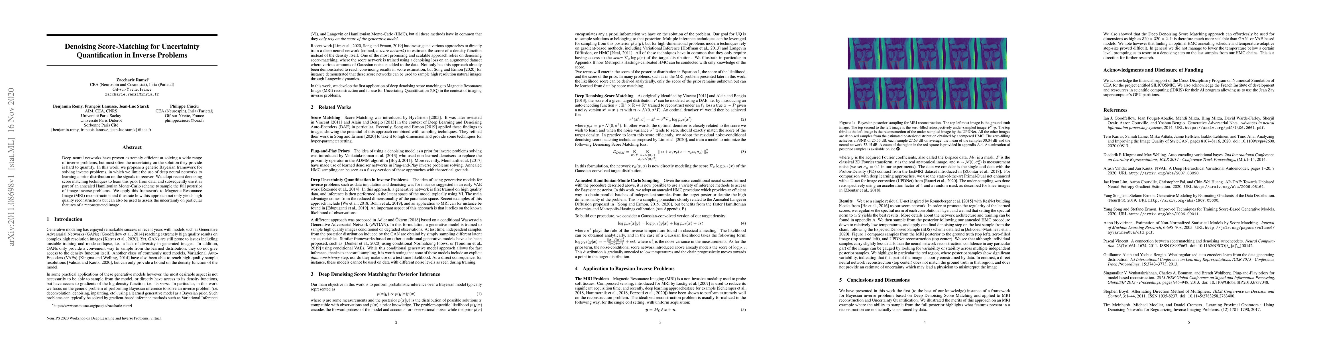 Deep neural networks have proven extremely efficient at solving a wide rangeof inverse problems, but most often the uncertainty on the solution they provideis hard to quantify. In this work, we propose a generic Bayesian framework forsolving inverse problems, in which we limit the use of deep neural networks tolearning a prior distribution on the signals to recover. We adopt recent denoisingscore matching techniques to learn this prior from data, and subsequently use it aspart of an annealed Hamiltonian Monte-Carlo scheme to sample the full posteriorof image inverse problems. We apply this framework to Magnetic ResonanceImage (MRI) reconstruction and illustrate how this approach not only yields highquality reconstructions but can also be used to assess the uncertainty on particularfeatures of a reconstructed image.