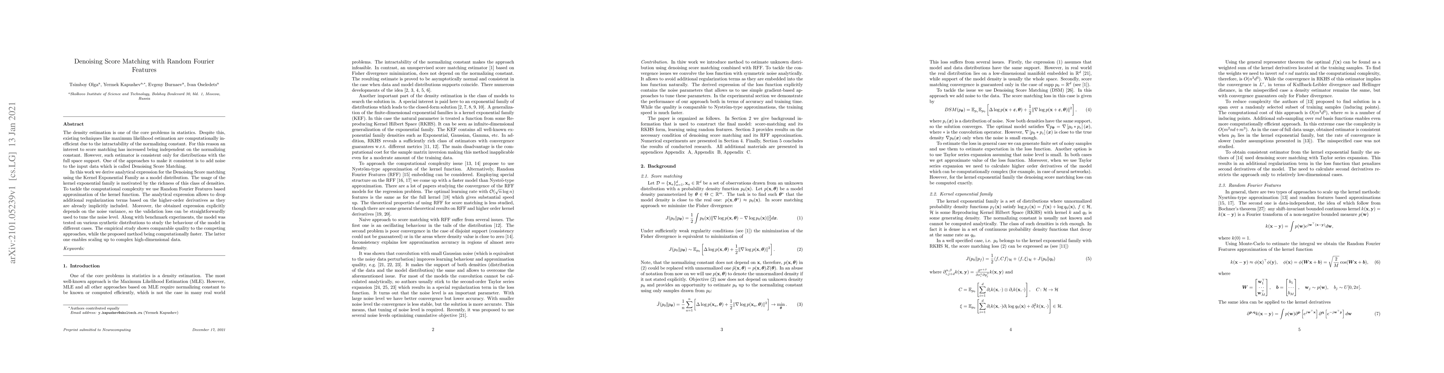 This paper proposes a computationally efficient Denoising Score Matching method using Random Fourier Features to approximate the kernel exponential family for density estimation. The analytical expression derived allows for tuning noise levels directly through validation loss, demonstrating comparable performance and scalability for high-dimensional data.
