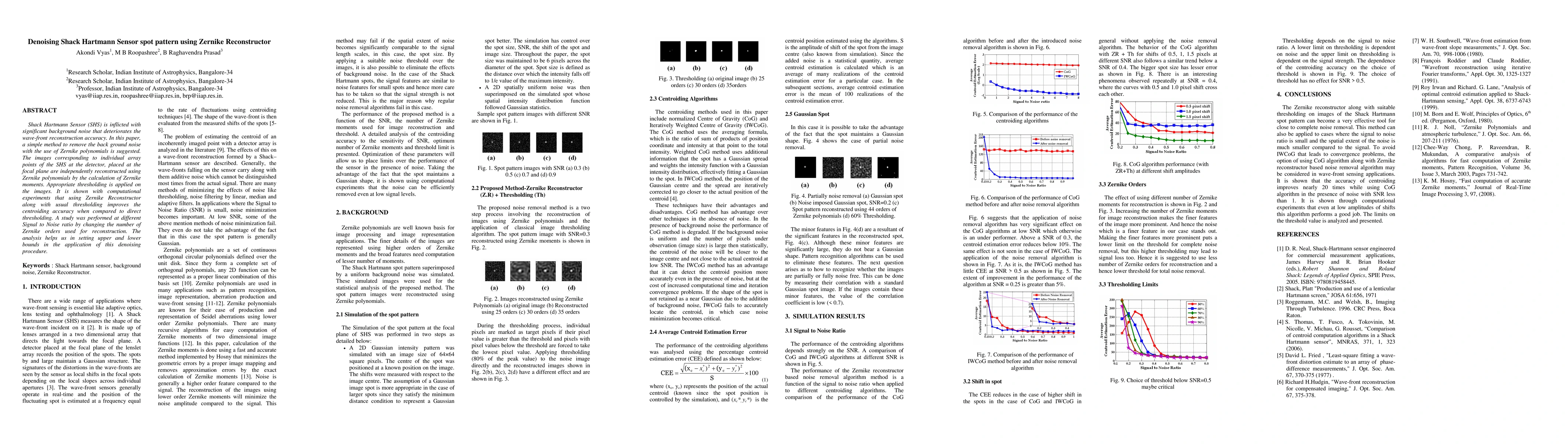This paper proposes a method for denoising Shack Hartmann Sensor (SHS) spot patterns using Zernike polynomials, which improves centroiding accuracy over direct thresholding. The Zernike Reconstructor calculates Zernike moments and applies thresholding, with computational experiments demonstrating its effectiveness at various signal-to-noise ratios.