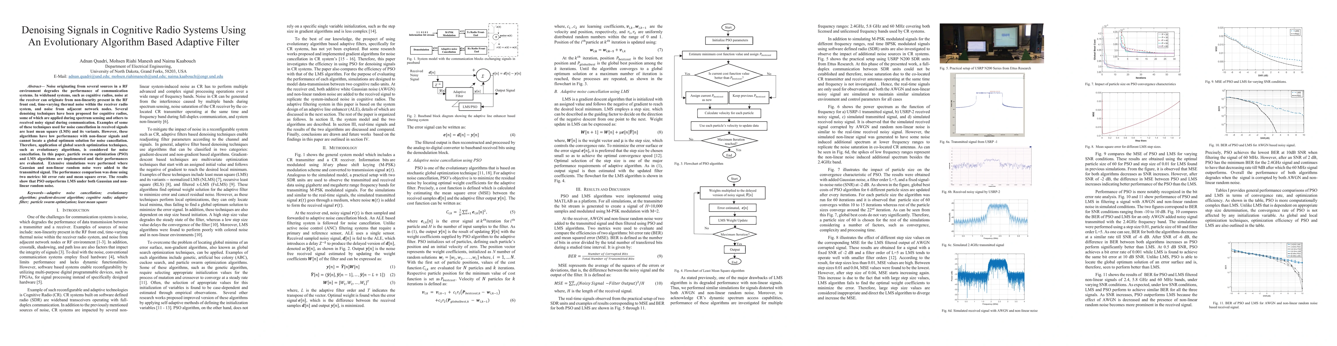 Noise originating from several sources in a RF environment degrades the performance of communication systems. In wideband systems, such as cognitive radios, noise at the receiver can originate from non-linearity present in the RF front end, time-varying thermal noise within the receiver radio system, and noise from adjacent network nodes. Several denoising techniques have been proposed for cognitive radios, some of which are applied during spectrum sensing and others to received noisy signal during communication. Examples of some of these techniques used for noise cancellation in received signals are least mean square (LMS) and its variants. However, these algorithms have low performance with non-linear signals and cannot locate a global optimum solution for noise cancellation. Therefore, application of global search optimization techniques, such as evolutionary algorithms, is considered for noise cancellation. In this paper, particle swarm optimization (PSO) and LMS algorithms are implemented and their performances are evaluated. Extensive simulations were performed where Gaussian and non-linear random noise were added to the transmitted signal. The performance comparison was done using two metrics: bit error rate and mean square error. The results show that PSO outperforms LMS under both Gaussian and nonlinear random noise.