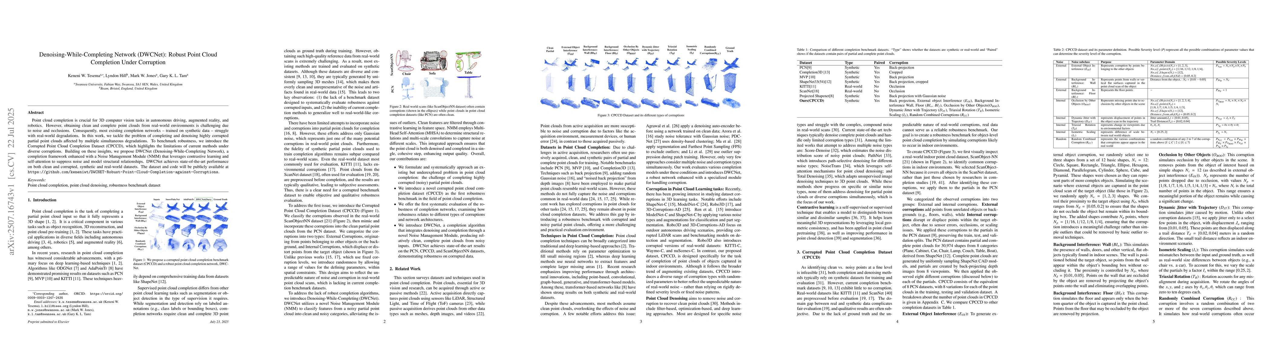 Point cloud completion is crucial for 3D computer vision tasks in autonomous driving, augmented reality, and robotics. However, obtaining clean and complete point clouds from real-world environments is challenging due to noise and occlusions. Consequently, most existing completion networks -- trained on synthetic data -- struggle with real-world degradations. In this work, we tackle the problem of completing and denoising highly corrupted partial point clouds affected by multiple simultaneous degradations. To benchmark robustness, we introduce the Corrupted Point Cloud Completion Dataset (CPCCD), which highlights the limitations of current methods under diverse corruptions. Building on these insights, we propose DWCNet (Denoising-While-Completing Network), a completion framework enhanced with a Noise Management Module (NMM) that leverages contrastive learning and self-attention to suppress noise and model structural relationships. DWCNet achieves state-of-the-art performance on both clean and corrupted, synthetic and real-world datasets. The dataset and code will be publicly available at https://github.com/keneniwt/DWCNET-Robust-Point-Cloud-Completion-against-Corruptions