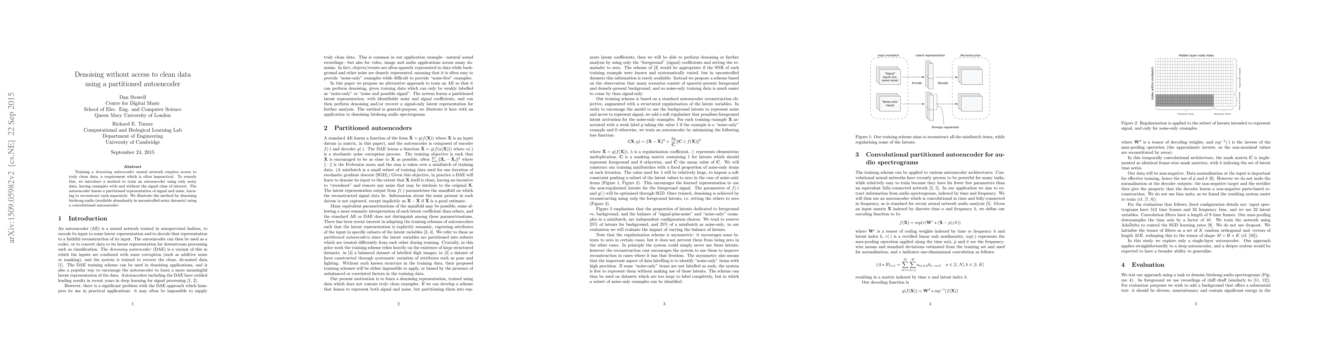 This paper proposes a method to train a denoising autoencoder using only noisy data without requiring clean examples, by partitioning the representation to separately reconstruct signal and noise. The approach is demonstrated through denoising birdsong audio with a convolutional autoencoder.