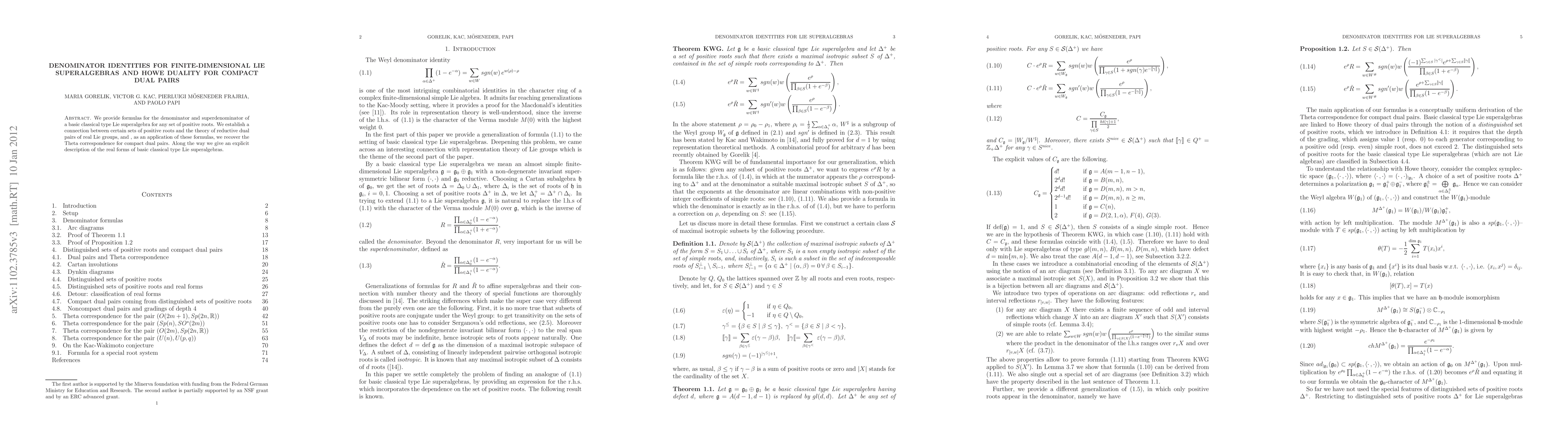We provide formulas for the denominator and superdenominator of a basic classical type Lie superalgebra for any set of positive roots. We establish a connection between certain sets of positive roots and the theory of reductive dual pairs of real Lie groups. As an application of our formulas, we recover the Theta correspondence for compact dual pairs. Along the way we give an explicit description of the real forms of basic classical type Lie superalgebras.