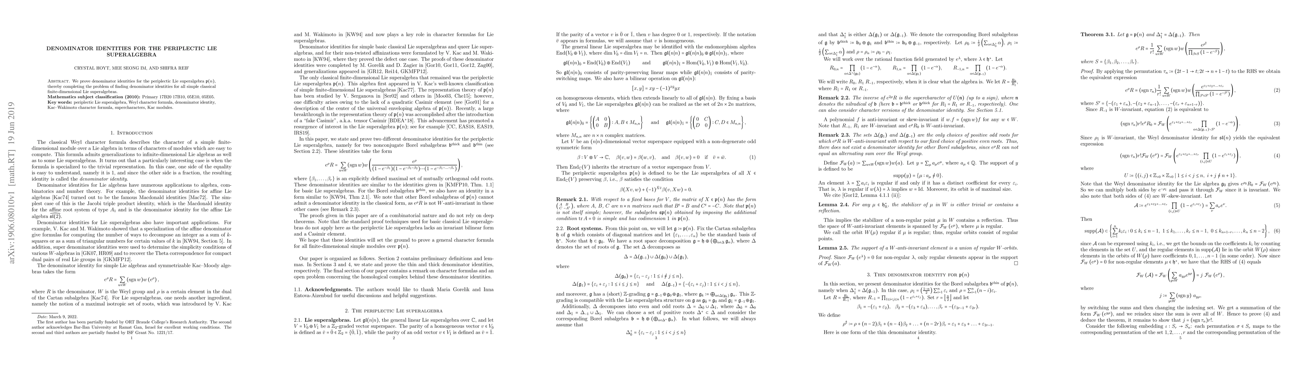 This paper proves denominator identities for the periplectic Lie superalgebra $\mathfrak{p}(n)$, completing the identification of such identities for all simple classical finite-dimensional Lie superalgebras. The results contribute significantly to the understanding of the algebraic structures underlying these superalgebras.