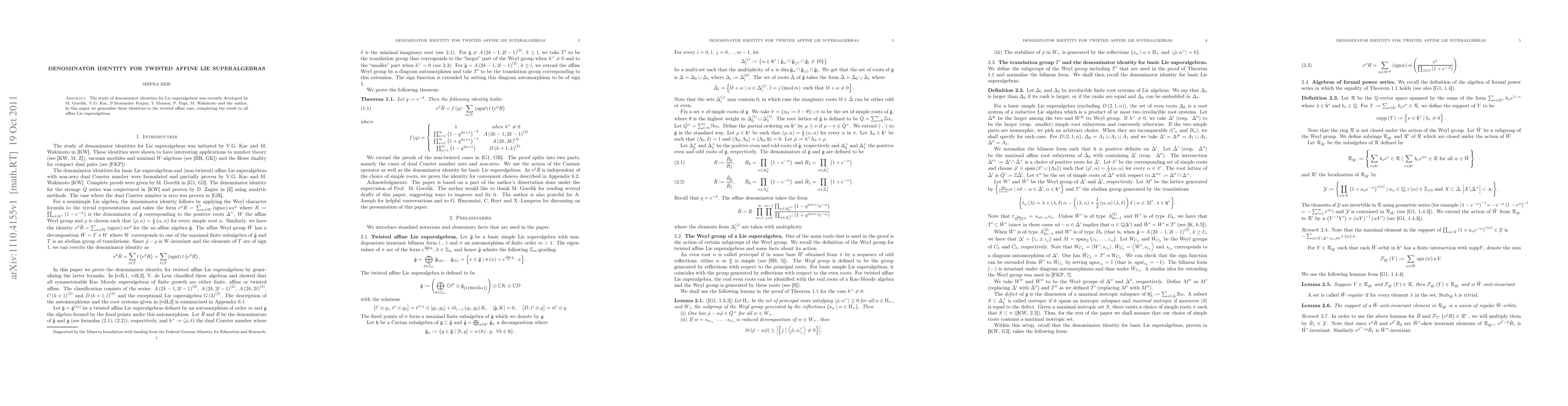 This paper generalizes previously established denominator identities for Lie superalgebras to the twisted affine case, thereby completing the results for all affine Lie superalgebras. The research builds on foundational work by several mathematicians, including Gorelik, Kac, and Wakimoto.