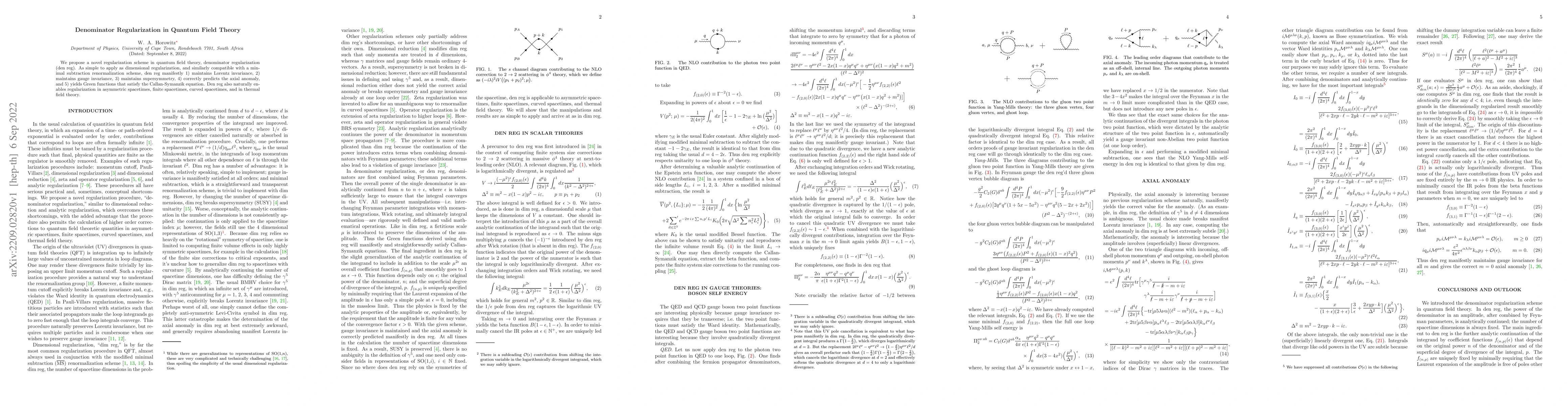 This paper introduces a new regularization method called denominator regularization (den reg) in quantum field theory, which maintains Lorentz, gauge, and supersymmetry invariances, predicts the axial anomaly correctly, and satisfies the Callan-Symanzik equation. Den reg is also compatible with minimal subtraction and applicable in various complex spacetimes.