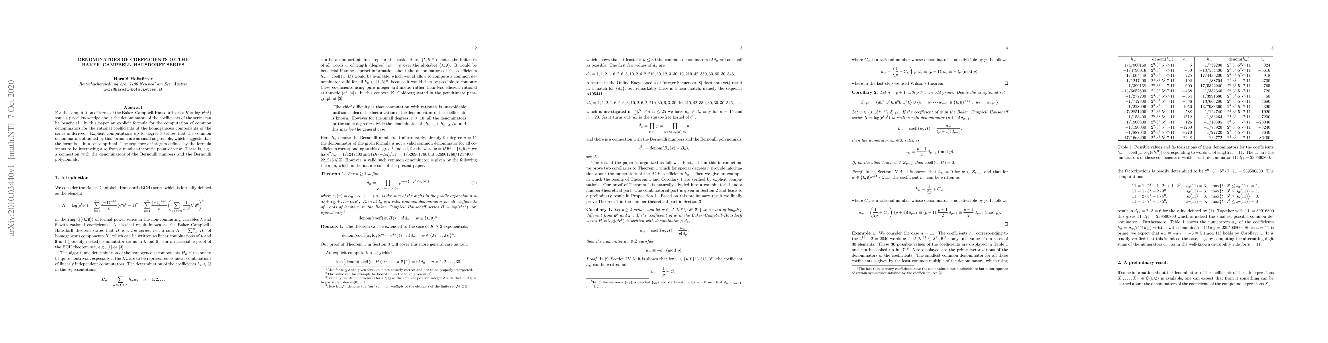 This paper derives an explicit formula for the common denominators of the rational coefficients in the Baker-Campbell-Hausdorff series, showing that these denominators are minimal up to degree 30. The sequence generated by the formula is also noted for its number-theoretic connections, including links to Bernoulli numbers and polynomials.