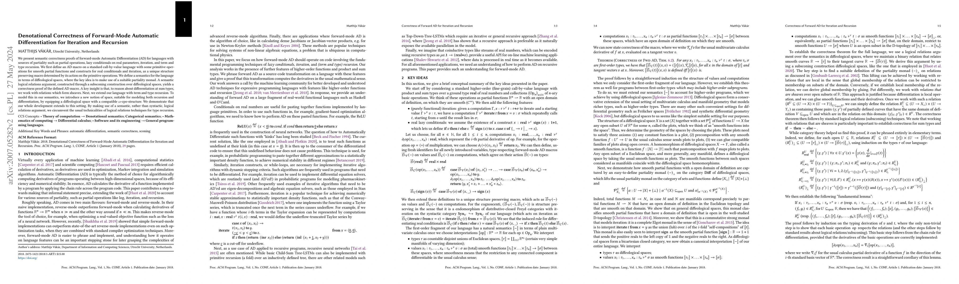 We present semantic correctness proofs of forward-mode Automatic Differentiation (AD) for languages with sources of partiality such as partial operations, lazy conditionals on real parameters, iteration, and term and type recursion. We first define an AD macro on a standard call-by-value language with some primitive operations for smooth partial functions and constructs for real conditionals and iteration, as a unique structure preserving macro determined by its action on the primitive operations. We define a semantics for the language in terms of diffeological spaces, where the key idea is to make use of a suitable partiality monad. A semantic logical relations argument, constructed through a subsconing construction over diffeological spaces, yields a correctness proof of the defined AD macro. A key insight is that, to reason about differentiation at sum types, we work with relations which form sheaves. Next, we extend our language with term and type recursion. To model this in our semantics, we introduce a new notion of space, suitable for modeling both recursion and differentiation, by equipping a diffeological space with a compatible $\omega$cpo-structure. We demonstrate that our whole development extends to this setting. By making use of a semantic, rather than syntactic, logical relations argument, we circumvent the usual technicalities of logical relations techniques for type recursion.
