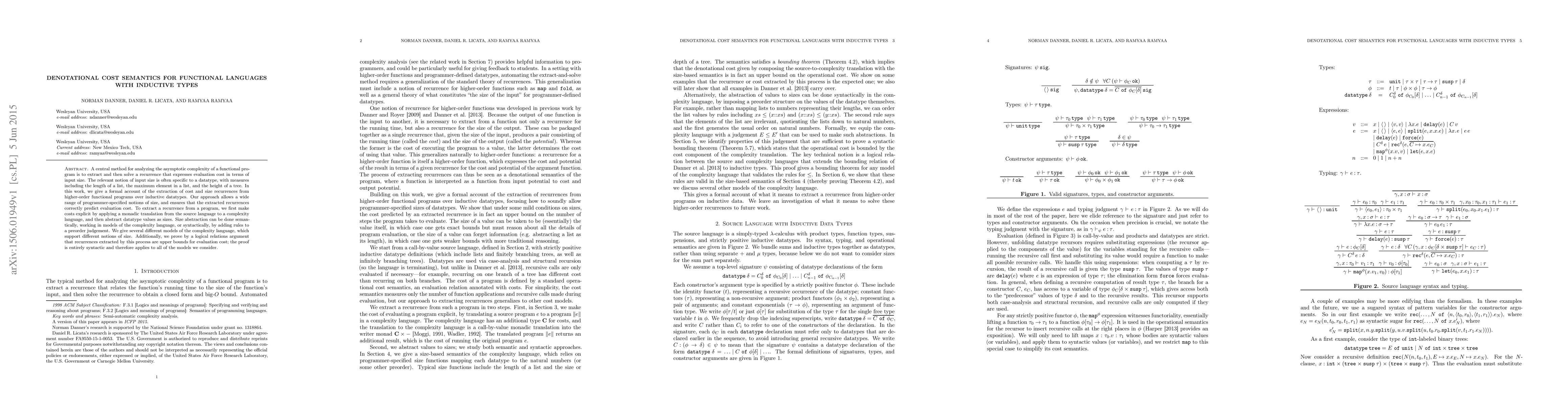 A central method for analyzing the asymptotic complexity of a functional program is to extract and then solve a recurrence that expresses evaluation cost in terms of input size. The relevant notion of input size is often specific to a datatype, with measures including the length of a list, the maximum element in a list, and the height of a tree. In this work, we give a formal account of the extraction of cost and size recurrences from higher-order functional programs over inductive datatypes. Our approach allows a wide range of programmer-specified notions of size, and ensures that the extracted recurrences correctly predict evaluation cost. To extract a recurrence from a program, we first make costs explicit by applying a monadic translation from the source language to a complexity language, and then abstract datatype values as sizes. Size abstraction can be done semantically, working in models of the complexity language, or syntactically, by adding rules to a preorder judgement. We give several different models of the complexity language, which support different notions of size. Additionally, we prove by a logical relations argument that recurrences extracted by this process are upper bounds for evaluation cost; the proof is entirely syntactic and therefore applies to all of the models we consider.