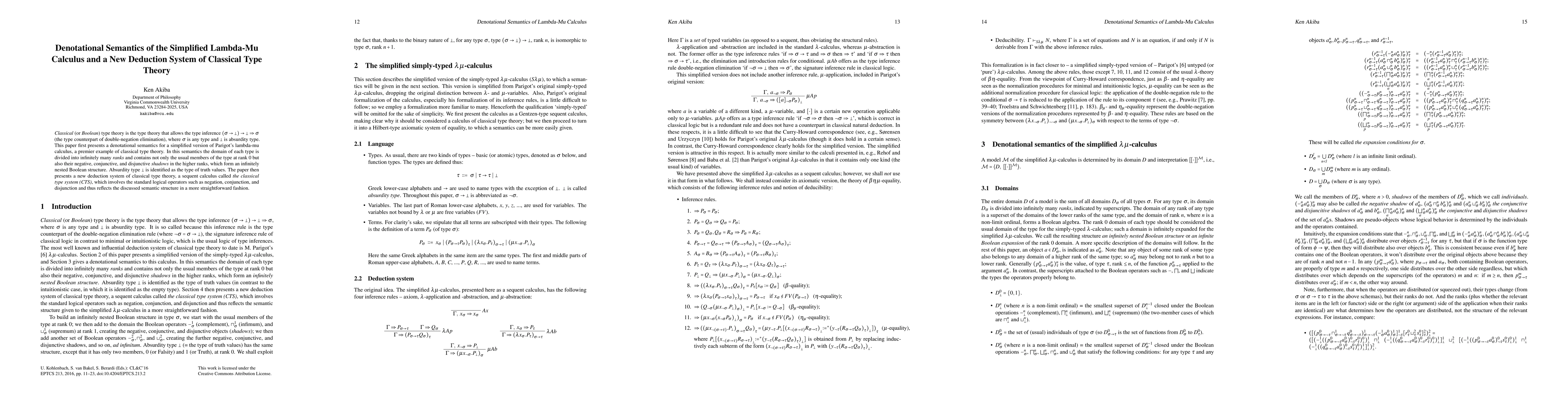 Classical (or Boolean) type theory is the type theory that allows the type inference $\sigma \to \bot) \to \bot => \sigma$ (the type counterpart of double-negation elimination), where $\sigma$ is any type and $\bot$ is absurdity type. This paper first presents a denotational semantics for a simplified version of Parigot's lambda-mu calculus, a premier example of classical type theory. In this semantics the domain of each type is divided into infinitely many ranks and contains not only the usual members of the type at rank 0 but also their negative, conjunctive, and disjunctive shadows in the higher ranks, which form an infinitely nested Boolean structure. Absurdity type $\bot$ is identified as the type of truth values. The paper then presents a new deduction system of classical type theory, a sequent calculus called the classical type system (CTS), which involves the standard logical operators such as negation, conjunction, and disjunction and thus reflects the discussed semantic structure in a more straightforward fashion.