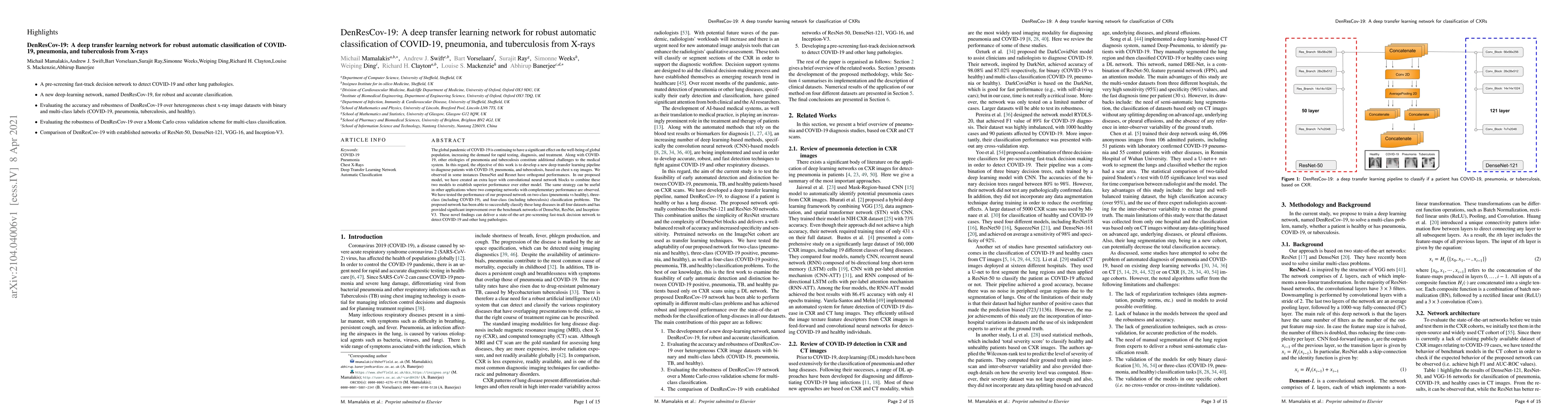 The paper introduces DenResCov-19, a deep transfer learning network combining DenseNet and ResNet to classify COVID-19, pneumonia, and tuberculosis from chest X-ray images. The proposed model shows superior performance over standalone DenseNet, ResNet, and Inception-V3, providing a robust tool for rapid diagnosis of lung diseases.