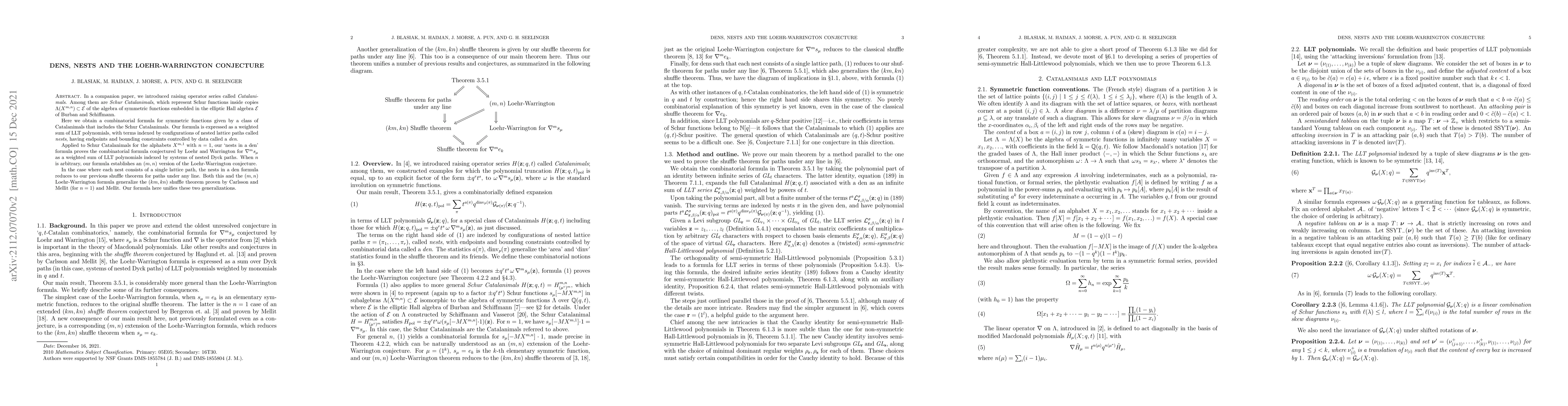 In a companion paper, we introduced raising operator series called Catalanimals. Among them are Schur Catalanimals, which represent Schur functions inside copies $\Lambda (X^{m,n})\subset \mathcal{E} $ of the algebra of symmetric functions embedded in the elliptic Hall algebra $\mathcal{E} $ of Burban and Schiffmann. Here we obtain a combinatorial formula for symmetric functions given by a class of Catalanimals that includes the Schur Catalanimals. Our formula is expressed as a weighted sum of LLT polynomials, with terms indexed by configurations of nested lattice paths called nests, having endpoints and bounding constraints controlled by data called a den. Applied to Schur Catalanimals for the alphabets $X^{m,1}$ with $n=1$, our `nests in a den' formula proves the combinatorial formula conjectured by Loehr and Warrington for $\nabla^m s_{\mu }$ as a weighted sum of LLT polynomials indexed by systems of nested Dyck paths. When $n$ is arbitrary, our formula establishes an $(m,n)$ version of the Loehr-Warrington conjecture. In the case where each nest consists of a single lattice path, the nests in a den formula reduces to our previous shuffle theorem for paths under any line. Both this and the $(m,n)$ Loehr-Warrington formula generalize the $(km,kn)$ shuffle theorem proven by Carlsson and Mellit (for $n=1$) and Mellit. Our formula here unifies these two generalizations.