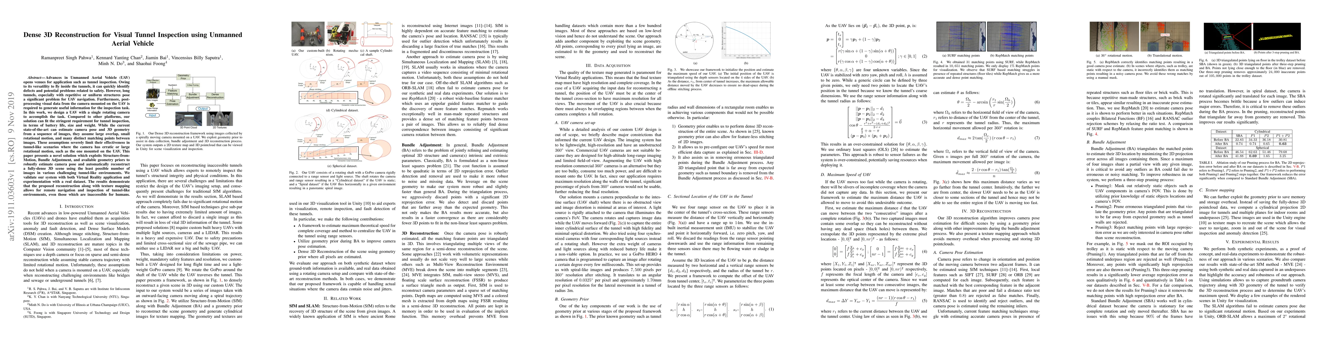 Advances in Unmanned Aerial Vehicle (UAV) opens venues for application such as tunnel inspection. Owing to its versatility to fly inside the tunnels, it can quickly identify defects and potential problems related to safety. However, long tunnels, especially with repetitive or uniform structures pose a significant problem for UAV navigation. Furthermore, post-processing visual data from the camera mounted on the UAV is required to generate useful information for the inspection task. In this work, we design a UAV with a single rotating camera to accomplish the task. Compared to other platforms, our solution can fit the stringent requirement for tunnel inspection, in terms of battery life, size and weight. While the current state-of-the-art can estimate camera pose and 3D geometry from a sequence of images, they assume large overlap, small rotational motion, and many distinct matching points between images. These assumptions severely limit their effectiveness in tunnel-like scenarios where the camera has erratic or large rotational motion, such as the one mounted on the UAV. This paper presents a novel solution which exploits Structure-from-Motion, Bundle Adjustment, and available geometry priors to robustly estimate camera pose and automatically reconstruct a fully-dense 3D scene using the least possible number of images in various challenging tunnel-like environments. We validate our system with both Virtual Reality application and experimentation with a real dataset. The results demonstrate that the proposed reconstruction along with texture mapping allows for remote navigation and inspection of tunnel-like environments, even those which are inaccessible for humans.