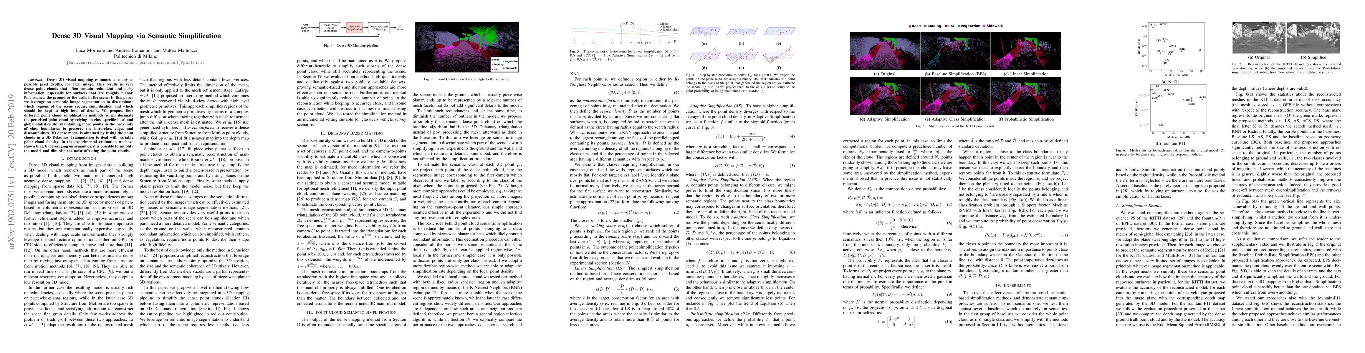 This paper proposes methods for dense 3D visual mapping using semantic simplification to reduce noise and redundancy in point clouds, especially for planar surfaces. It introduces four point cloud simplification techniques that maintain details near class boundaries while leveraging semantic segmentation to identify regions requiring simplification.