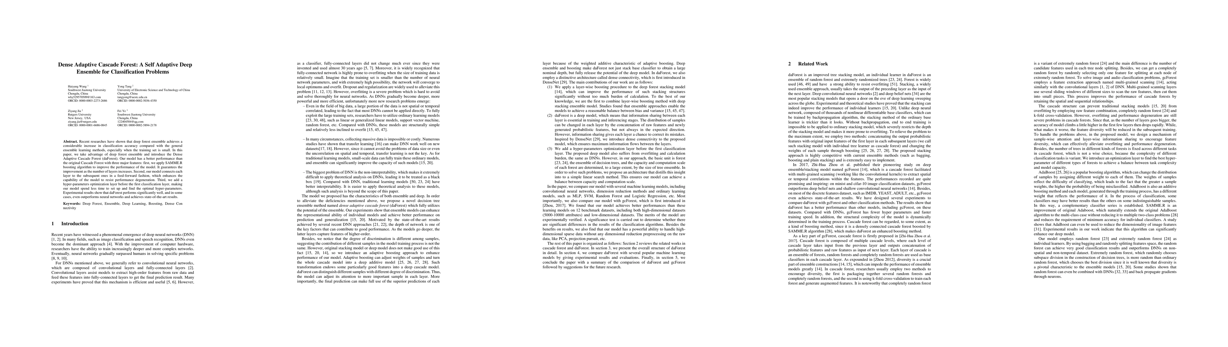 The Dense Adaptive Cascade Forest (daForest) is a self-adaptive deep ensemble model that enhances classification accuracy, especially with small training sets. It outperforms traditional Cascade Forest through SAMME.R boosting, feed-forward layer connections, and an optimized hyperparameter layer, achieving state-of-the-art results.