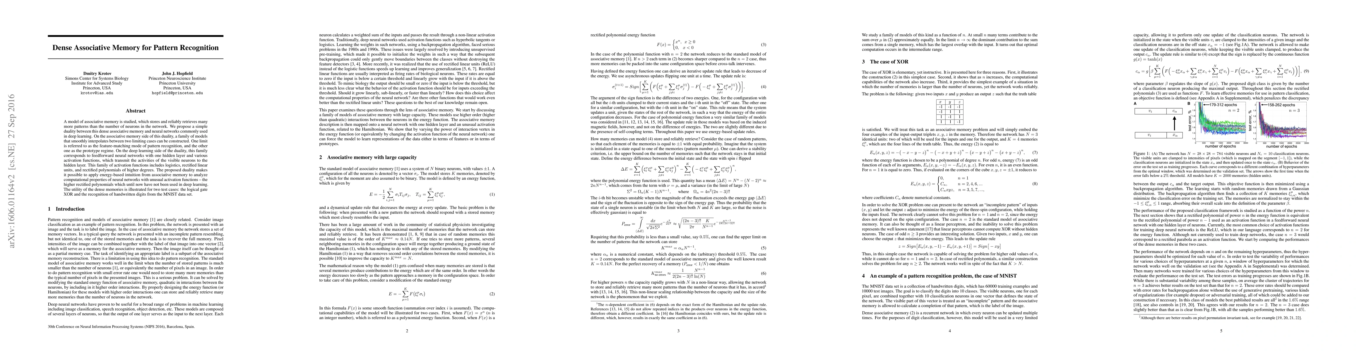 A model of associative memory is studied, which stores and reliably retrieves many more patterns than the number of neurons in the network. We propose a simple duality between this dense associative memory and neural networks commonly used in deep learning. On the associative memory side of this duality, a family of models that smoothly interpolates between two limiting cases can be constructed. One limit is referred to as the feature-matching mode of pattern recognition, and the other one as the prototype regime. On the deep learning side of the duality, this family corresponds to feedforward neural networks with one hidden layer and various activation functions, which transmit the activities of the visible neurons to the hidden layer. This family of activation functions includes logistics, rectified linear units, and rectified polynomials of higher degrees. The proposed duality makes it possible to apply energy-based intuition from associative memory to analyze computational properties of neural networks with unusual activation functions - the higher rectified polynomials which until now have not been used in deep learning. The utility of the dense memories is illustrated for two test cases: the logical gate XOR and the recognition of handwritten digits from the MNIST data set.