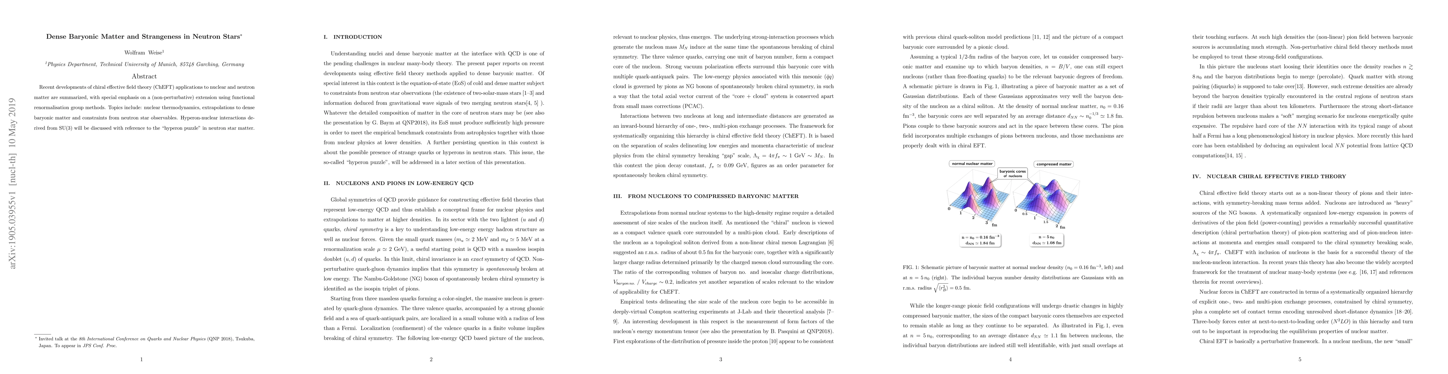 Recent developments of chiral effective field theory (ChEFT) applications to nuclear and neutron matter are summarized, with special emphasis on a (non-perturbative) extension using functional renormalisation group methods. Topics include: nuclear thermodynamics, extrapolations to dense baryonic matter and constraints from neutron star observables. Hyperon-nuclear interactions derived from SU(3) will be discussed with reference to the "hyperon puzzle" in neutron star matter.
